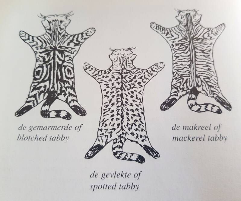 Tabby: Deze aftekening komt in alle kleuren voor binnen de NFO en is zeker in de kitten fase heel goed te zien. De ‘M’ op het voorhoofd blijft wel goed zichtbaar. Op de wangetjes zie je lopen horizontaal 2 a 3 strepen, op de poten en staart ringetjes. Wat ook wel leuk is is dat bij alle tabby’s de neus een donker randje zichtbaar is tenzij er witte vacht om de neus zit, dan is het nagenoeg niet zichtbaar.