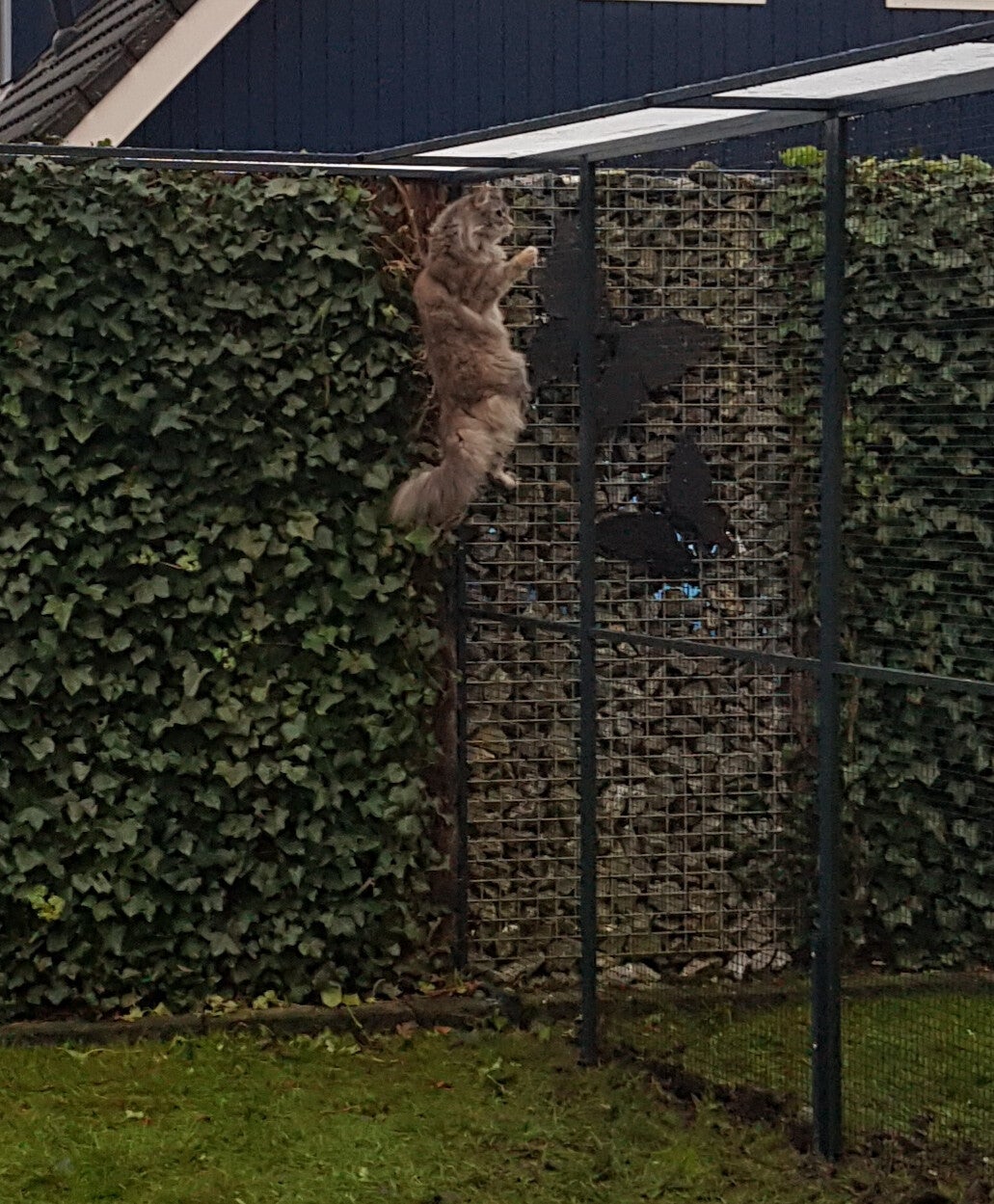 Foto's vanaf 2023: het donderstralen gaat gewoon door.... Er blijft geen plant heel, vogels kunnen gelukkig veilig aan de andere kant van het hek de bengels op stang jagen en menig vlinder, libelle, torren, kikkers, vleermuizen etc etc zijn gevangen of opgejaagd. We proberen het zo leuk en uitdagend te maken voor de bengels wat mogelijk is. Ze hebben veel ruimte en kunnen hun energie goed kwijt. En genoeg plekjes om lekker bij te komen.