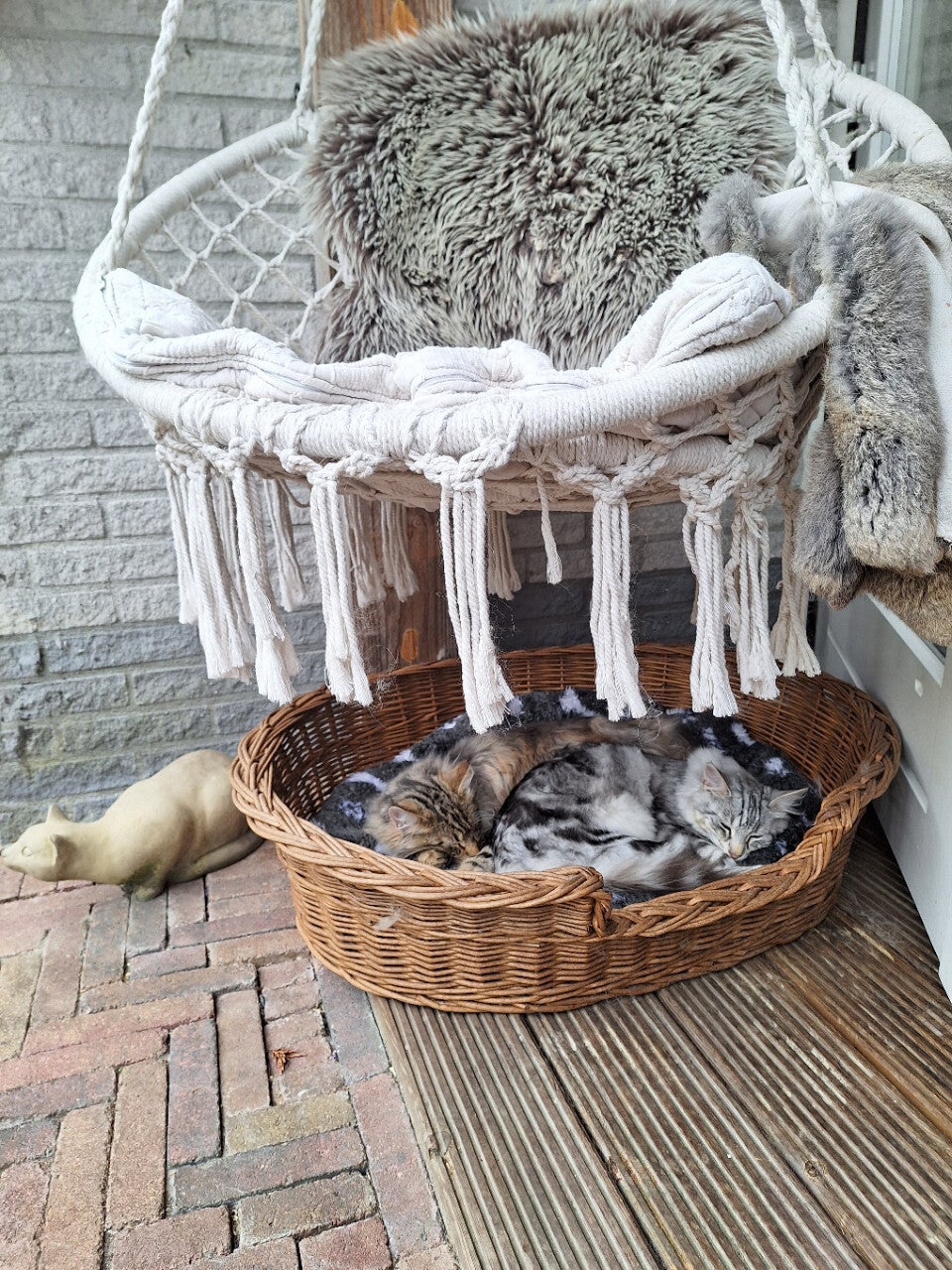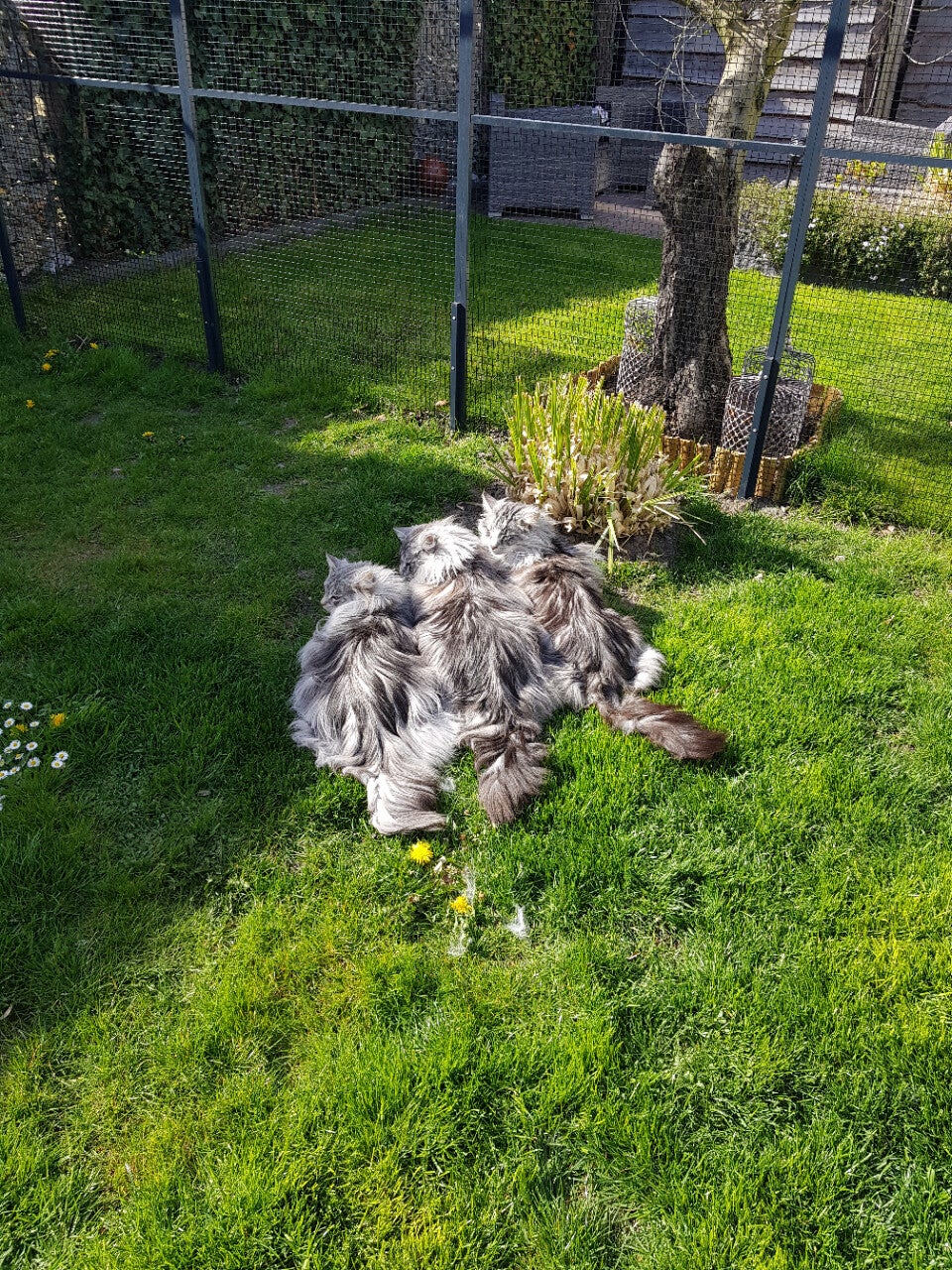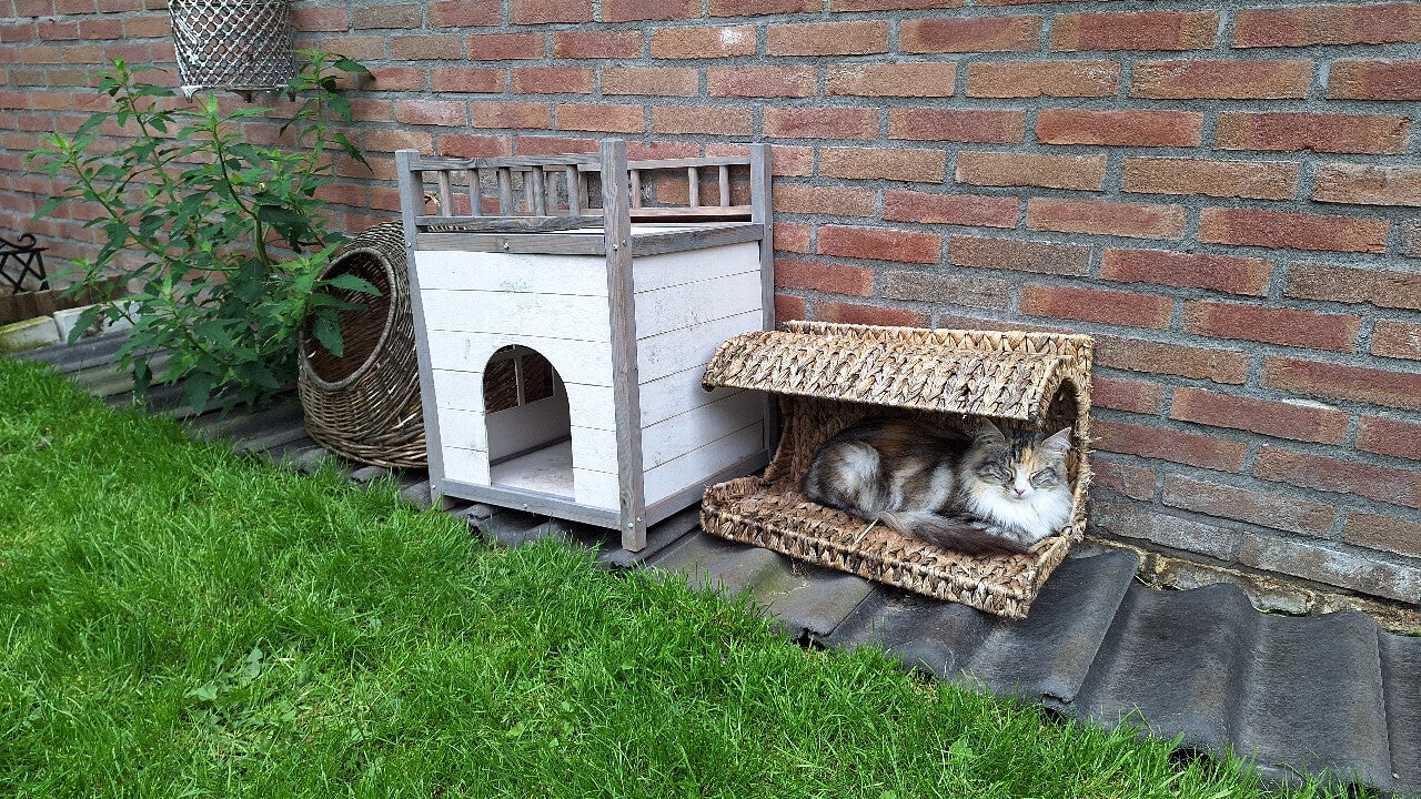 Zomer 2022: de beukenhaag heeft de 7 dwergjes en een bengel race traject niet overleefd, er staan nog 2 sprietjes. De sterke boeren hortensia's groeien wijd en plat: dat bleken prachtige verstopplekken te zijn. Het palmgras werd als verstopplek en als kattengras gezien maar was te venijnig scherp dus eruit. Met gras kun je alles dus ook op plassen: gele plekken. Inmiddels ook een eigen buiten zandbak om in te plassen en poepen, vlak naast die van Kjell. Dat scheelt veel irritaties over het toilleteren in de perken. Boomstammen erbij, picknicktafel in het midden, en zonder kittens kan de tipi ook blijven staan, anders ligt ie namelijk zo plat, ondanks haringen in de grond. Kortom: een vloeiend project! Meeveren, inschatten, toegeven maar bovenal genieten van de vrijheid van de bengels en hun plezier in een veilige omgeving!