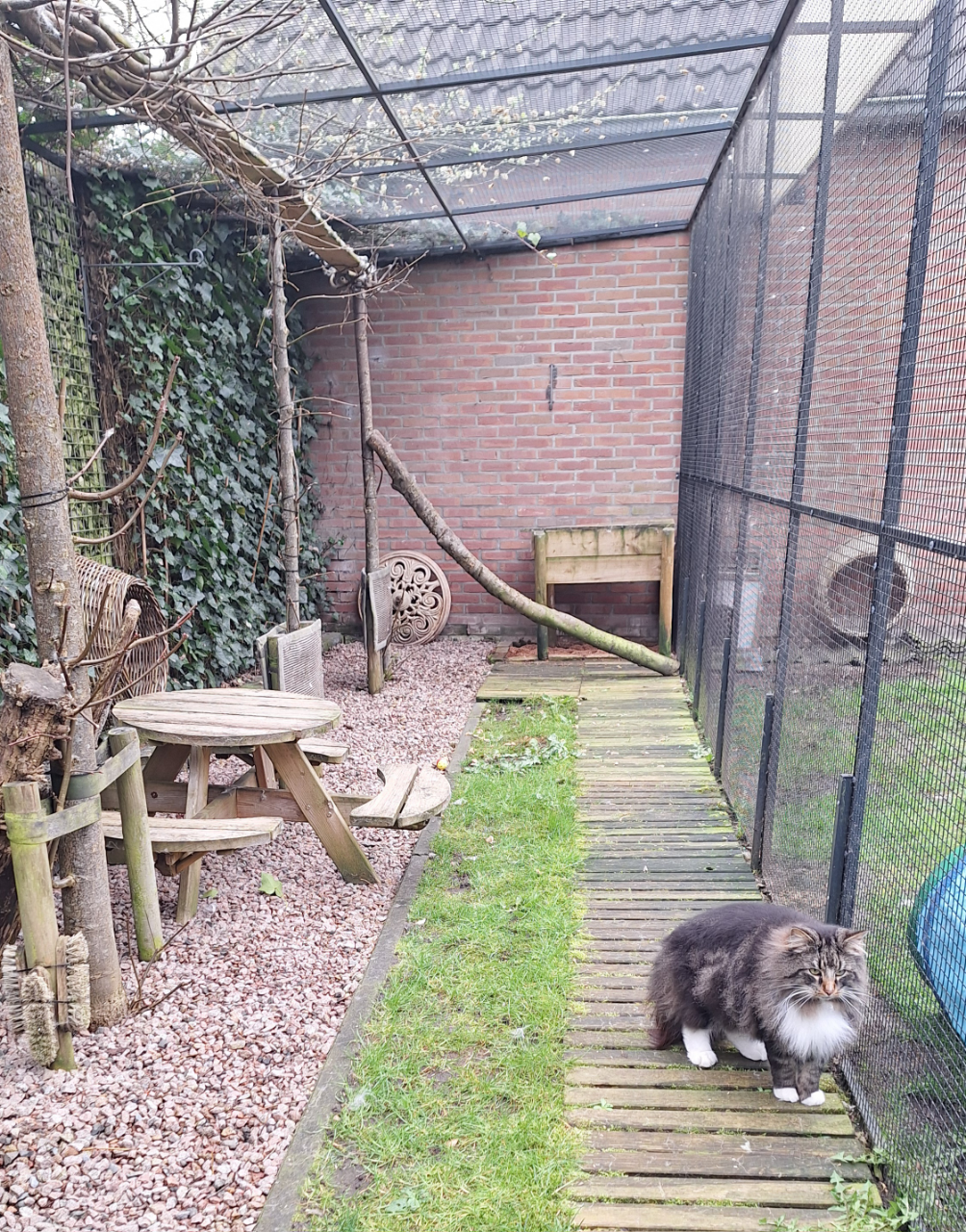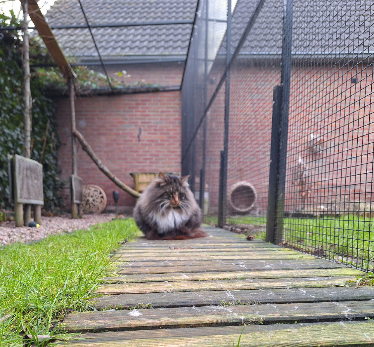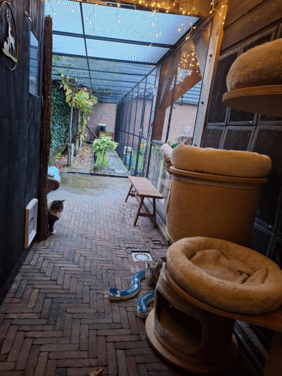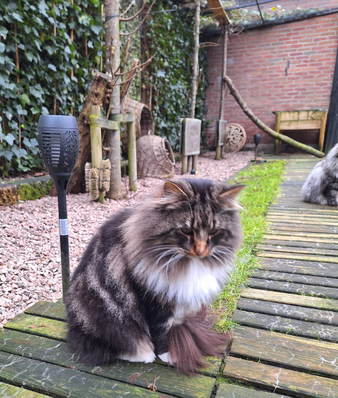 2022: Kjell is zijn actieve leven als dekkater begonnen. Op welke manier dan ook hebben de dieren bij ons zo hun functie. Van allemaal wordt niet alleen gehouden maar zeer zeker ook het beste voor gezorgd. Een open dekkater zoals je dat noemt, is indien ze plassen en sproeien in een beetje normaal huishouden niet te handhaven. Een eigen verblijf geeft ook rust en duidelijkheid voor de kater zelf. Kjell ziet zijn schuur, schuilhok met verblijf/slaaphok en 13 meter lange ren dan ook echt als zijn territorium. Hij grenst aan huis en de gemeenschappelijke tuin, met regelmaat op de dag kan er ook een andere kat, of hond, bij hem komen. En die willen graag daar heen want bij Kjell is het stoer, daar let hooman-mama niet zo op je, daar mag je plassen. De komende maanden gaan we sowieso met Kjell zijn tuin en de gemeenschappelijke tuin bezig voor speel en klim mogelijkheden en begroeiing. Vrij rond laten lopen in huis is geen doen maar dan moet het wel het leukste onderkomen/verblijf zijn die wij kunnen bedenken. Zolang hij happy is en zichzelf niet verwaarloosd kan dit. Wij monitoren dit natuurlijk.
