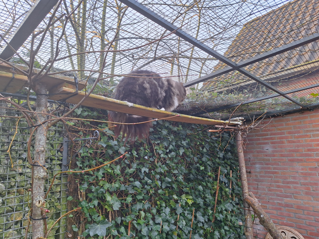 Het geisoleerde binnen verblijf en overkapt gedeelte van Kjell en Nola. Met de atributen wisselen we vaak wat af qua opstelling en/of toevoegingen om het ook uitdagend voor hun te houden. Ook zijn er geschikte andere bengels vaak bij hun.