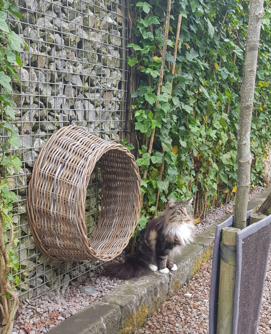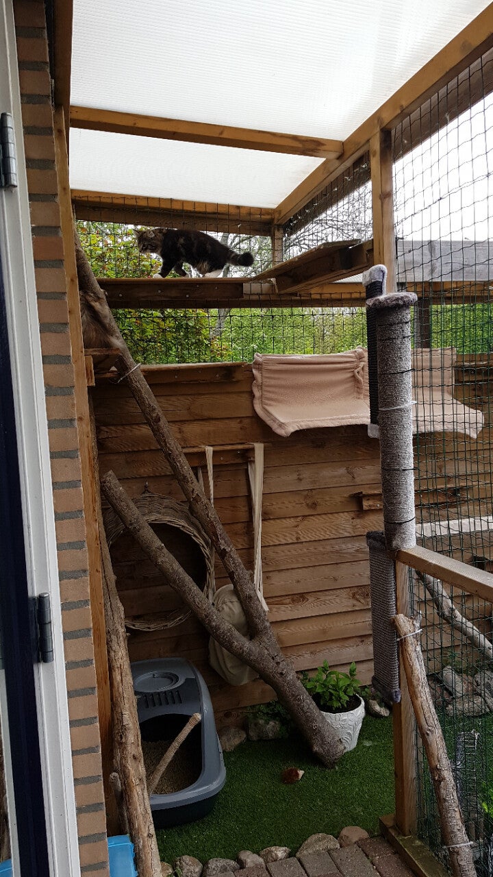 Hieronder foto's van Kjell in zijn habitat, vaak ook met 1 of meerderen erbij in. En de ren wordt steeds mooier, de loopbrug steeds meer begroeid. Kjell ziet het ook echt als zijn domein dus helaas kunnen de andere jongens er inmiddels niet meer bij zonder dat hij zich laat gelden. Maar voor dames die rustig zijn qua krolsheid tot aan kittens: welkom!