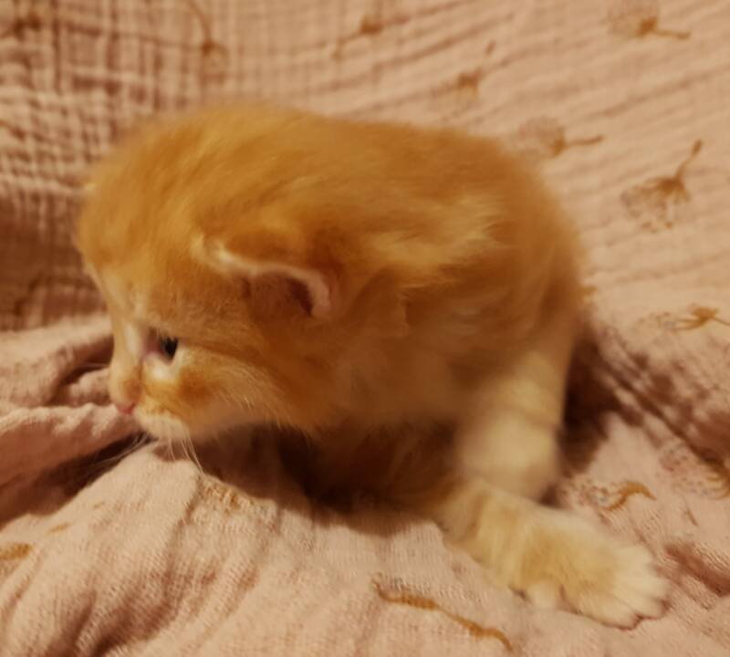 Potdikkie, wat een ontzettend mooi, vossenrood mannetje kwam daar te voorschijn! Daar was vakre Brandr! Om 5:40 uur geboren en waar het eerst nog leek dat hij witte sokjes had, is dat al steeds meer de lichtere aftekening van het tabby zijn geworden. Prachtig, ik kan niet anders zeggen. De naam Brandr betekent in het Noors 'zwaard'. Brandr woog 102 gram bij zijn geboorte en is een red tabby blotched katertje. Welkom lieverd!
