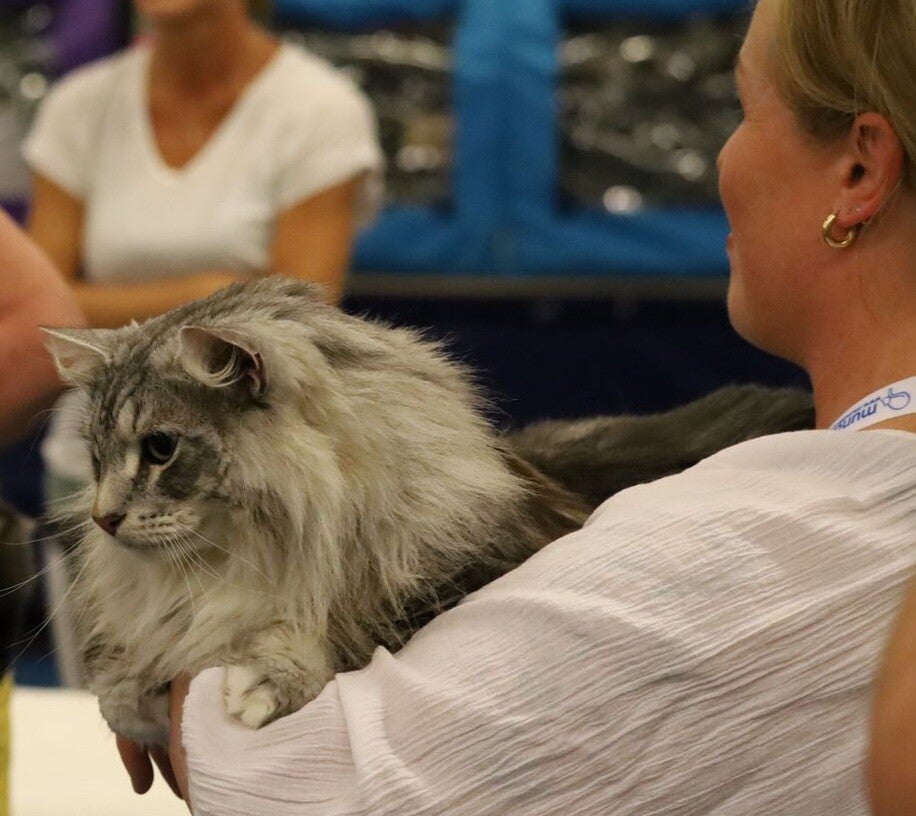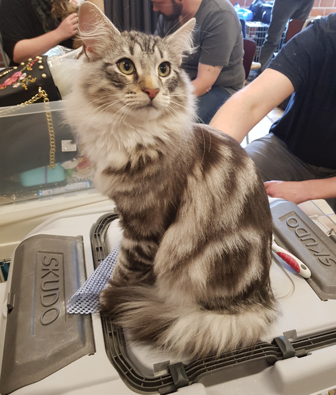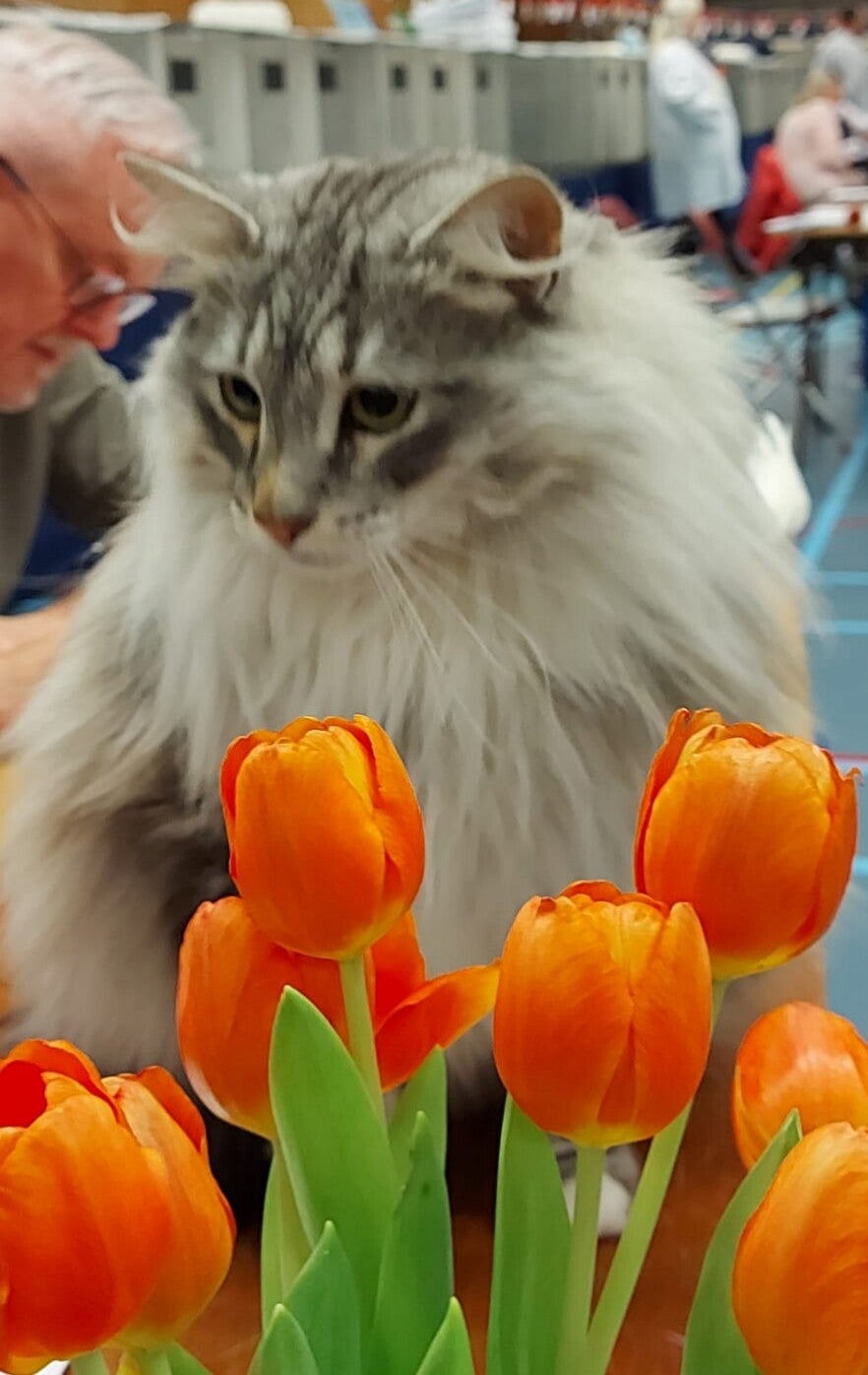 31-03-2019 Heeft Leifr zijn eerste kennismaking met show en een grotere groep mensen bij elkaar gehad. Hij was volledig in zijn element, vond het fantastisch! Hij heeft heerlijk op schoot gezeten en liet zich makkelijk showen. Hij kreeg dan ook een super keurrapport: Excl. 2 (in de categorie 6-10 mnd.) + dat hij de winnaar is geworden van de mooiste zilver zwart tabby's ronde.