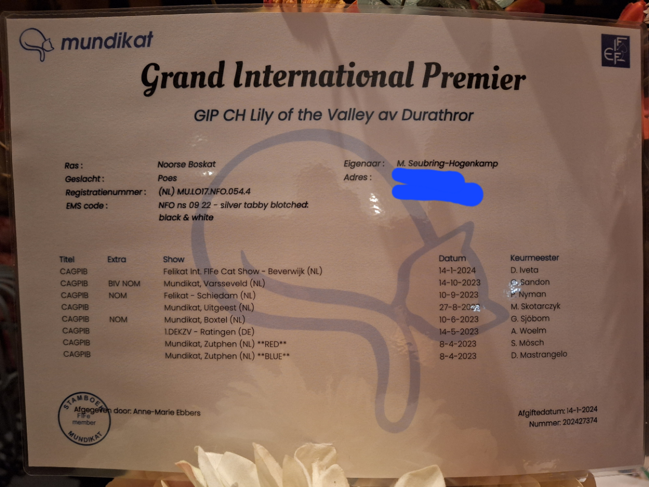 En het is nu officieel: de titel is behaald! Vanaf nu zal Lily door het leven gaan als Grande International Premior/Champion Lily of the Valley av Durathror!