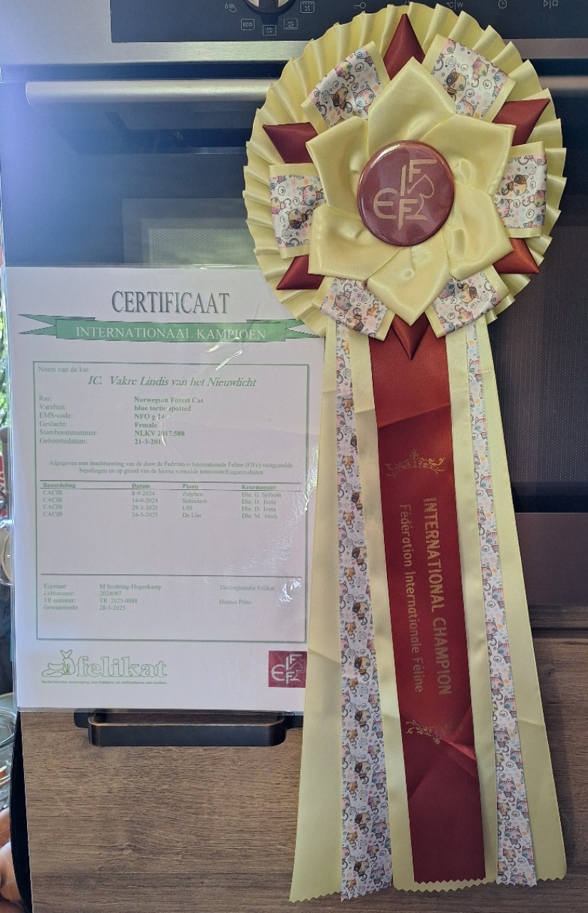 *Showresultaat vakre Lindis bij Felikat te De Lier op 24-5-2025: 4e CACIB certificaat. En met deze laatste punt heeft ze haar nieuwe titel behaald en gaat zij voortaan door het leven als International Champion vakre Lindis van het Nieuwlicht.