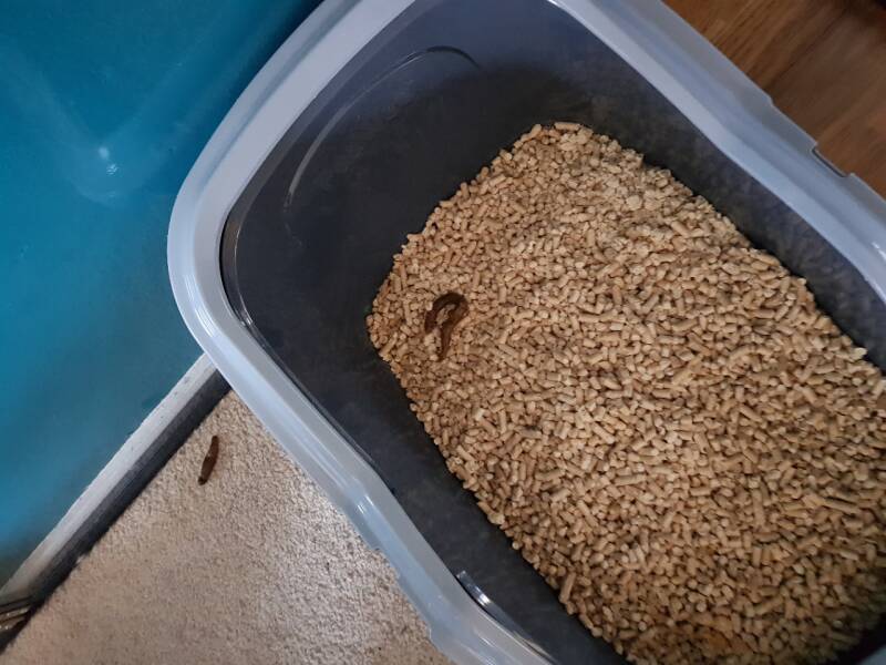 En dan begint de fase van zindelijkheid, mama ruimt het niet meer op want de kittens zijn al redelijk aan het afspenen en eten zelf vlees mee. Eerst is de kittenkattenbak een speelplaats. En dan zie je een 50/50 trots moment: 1 drolletje in de kattenbak en 1 er vlakbij. Hoe trots kun je zijn!?