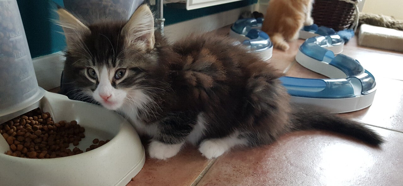6-6-2020: Nog zo'n zachtaardig type, Cosma. Dit lieve mannetje vindt aandacht heerlijk en komt over als een lief en zacht type die wel heel veel lef heeft. Hij klimt graag tot in de top van de plafond klimpalen en gaat daar dan op de hoogste plank liggen. Hoewel hij gewone eetlust heeft moeten we hem er vaak nog bij roepen of pakken als de rest allang zit te eten. Hij was dan heerlijk in dromenland op zijn uitkijkplank en realiseert zich pas later dat ook hij mag komen eten. Dan klimt ie al miauwend naar beneden en zoekt zijn plek aan de schaal met vlees. Cosma is een mooi groot Noors mannetje met zijn 1,170 kg. Deze week van Cosma ook actie foto's i.p.v. echte poseer foto's. En net als bij Julien een foto van hun saampjes.