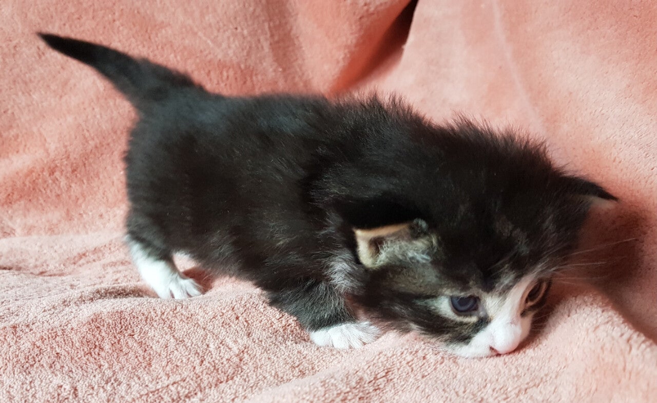 25-4-2020: 3 weekjes jong, Cosma is de charmeur van de 7 met dat mooie koppie van 'm. Dit helder kijkende mannetje kan je zo verliefd aankijken vanuit de bak. Hij is kalmer dan zijn donkere broertje, op dit moment dan. En wat lijkt hij ook op zijn vader qua uiterlijk met zijn prachtige tekening. Hij heeft ook echt zijn pootjes al ontdekt en loopt redelijk vast met grote passen de bak door. Cosma is op dit moment de zwaarste van de 7 met zijn 451 gram.