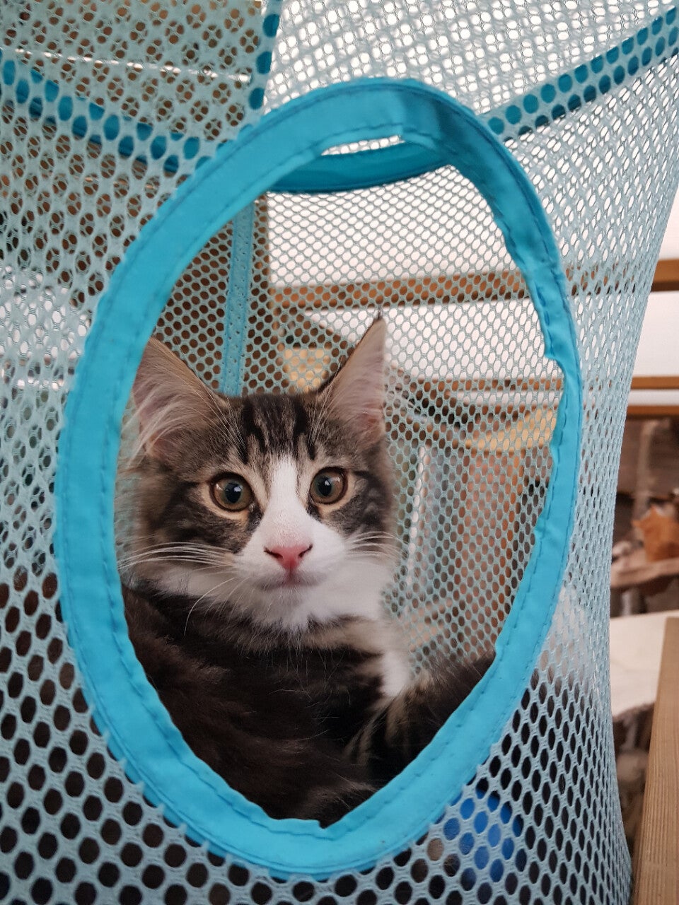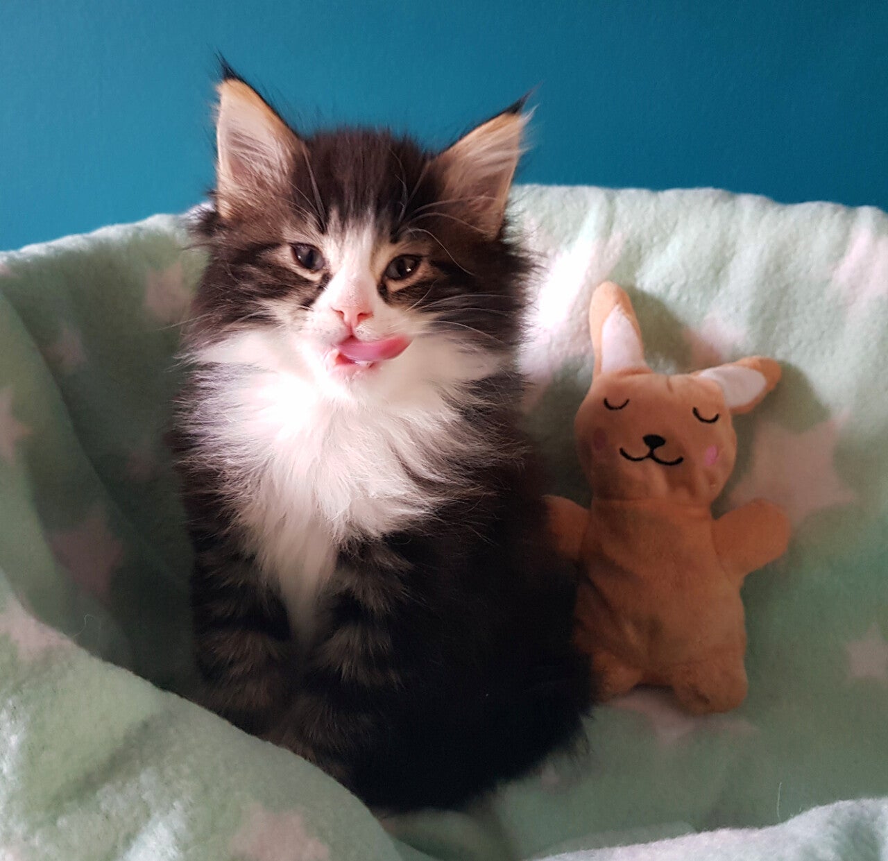 11-7-2020 en Cosma is 14 weken. Wat vliegt de tijd toch, waar de rest langzaam aan gaat verhuizen blijft ook Cosma nog wat langer . Gelukkig maar. Want hij is ook zo'n heerlijk ventje. Hij is de grote pestkop-broer voor Nana. Als zij gefocust is op haar speeltje, haar prooi, gaat hij haar juist spelend aanvallen. Nana is een gemakkelijk doelwit want die reageert ook. Het gekrijs en gegrom wakkert het alleen maar meer aan bij Cosma. Je zou zijn stoute blik moeten zien. Hij is zo'n schatje maar ja, je moet je energie bij iemand kwijt. Cosma woog de 11e 2,110 kg. Heerlijk dat je nog wat langer blijft, lief boefje.