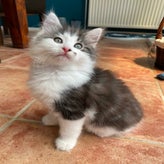 25-4-2020: 3 weekjes jong, en ons lange wachten werd beloond...Gimbel deed zijn ogen open! Hij nam zijn tijd, was de allerlaatste maar wat was het het wachten waard. Als laatste geboren, als laatste zijn oogjes open maar vooraan om de bak te ontdekken. Hij zal wel denken: ik heb zolang alles gehoord, nu wil ik het zien. Nog steeds zijn stembanden als eerste benuttend, snel lopend door de bak, kijkend naar waar het geluid ('babieeesss') vandaan komt. Hij vindt de aandacht heerlijk en spint dan luid. Wat is Gimbel een plezier om naar te kijken, hoe dat koppie ook weer zo is verandert nu zijn ogen open zijn. Met dat schattige vlekje. Gimbel weegt een mooie 442 gram.
