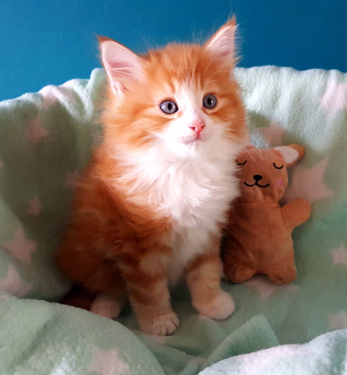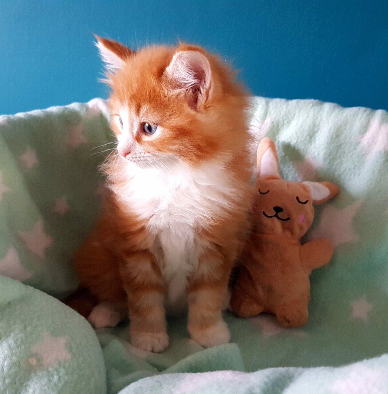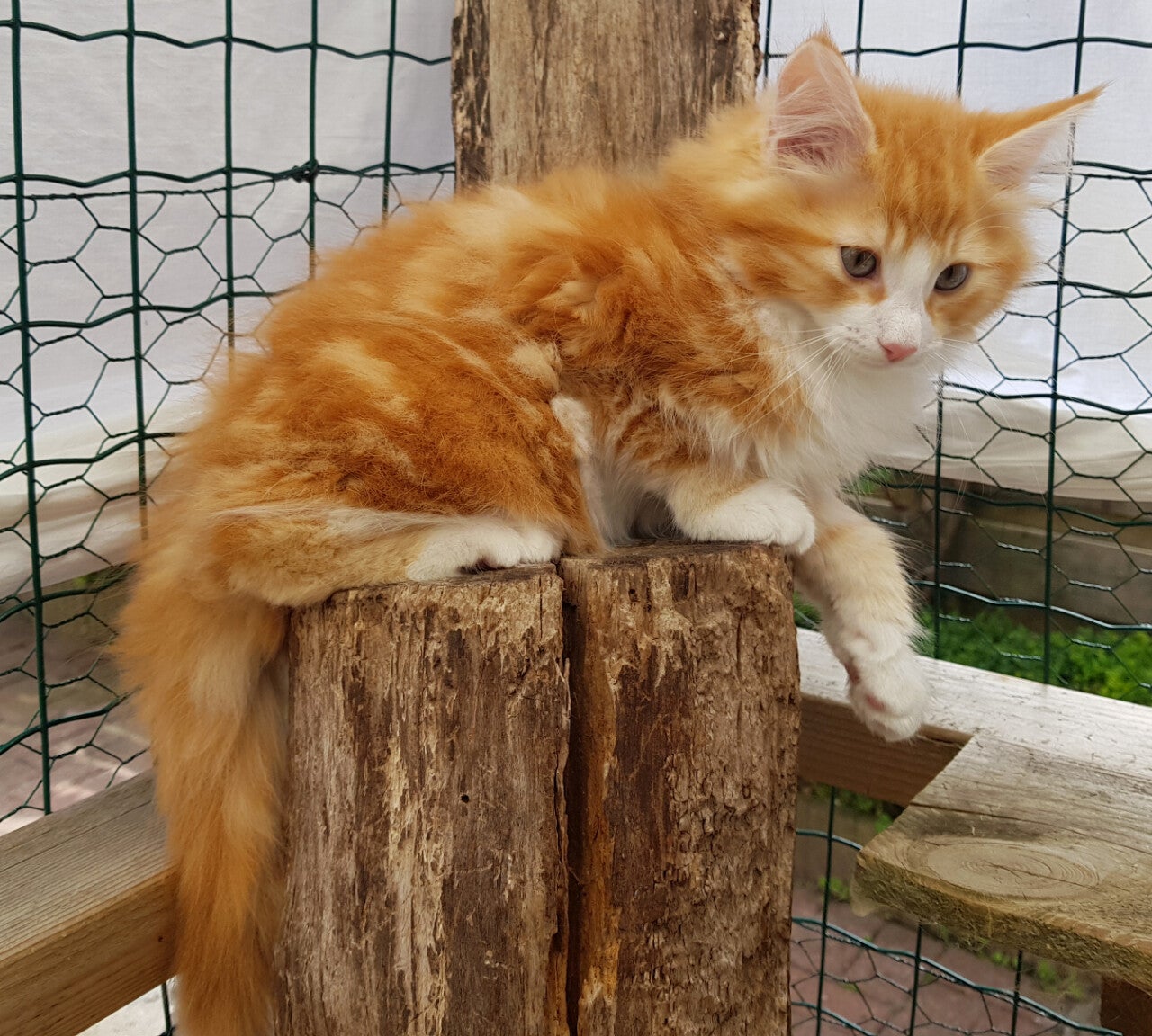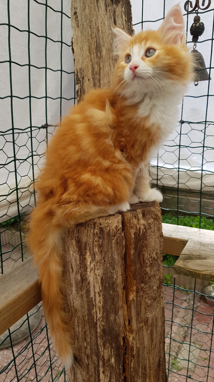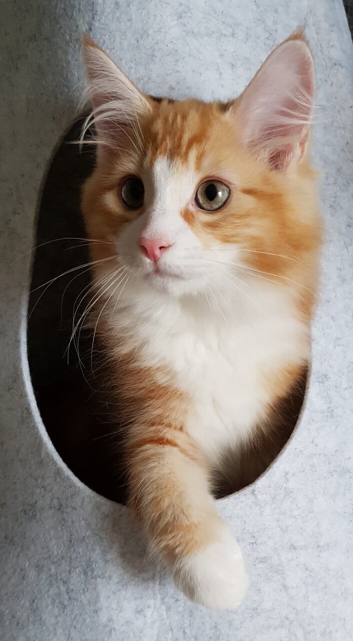 11-7-2020: 14 weken jong zijn de 7 ling en Julien groeit en speelt zoals we niet anders zouden verwachten. Een heerlijk lief boefje die op dat moment 2,130 kg woog. Julien en Cosma blijven wat langer bij ons omdat ze naar België verhuizen en dat is voor ons geen straf en zeker voor Sissel ook erg leuk. Zo gaan zij met z'n drietjes de beginselen van kattenkwaad uithalen de 3 ling, Caspian, Cedrik en Caspar, wel bijbrengen.... Ook al realiseren we ons dat ook Julian ooit verhuisd, we gaan nog lekker van de verlengde tijd genieten. Of niet dan, lief rood knuffel beertje!