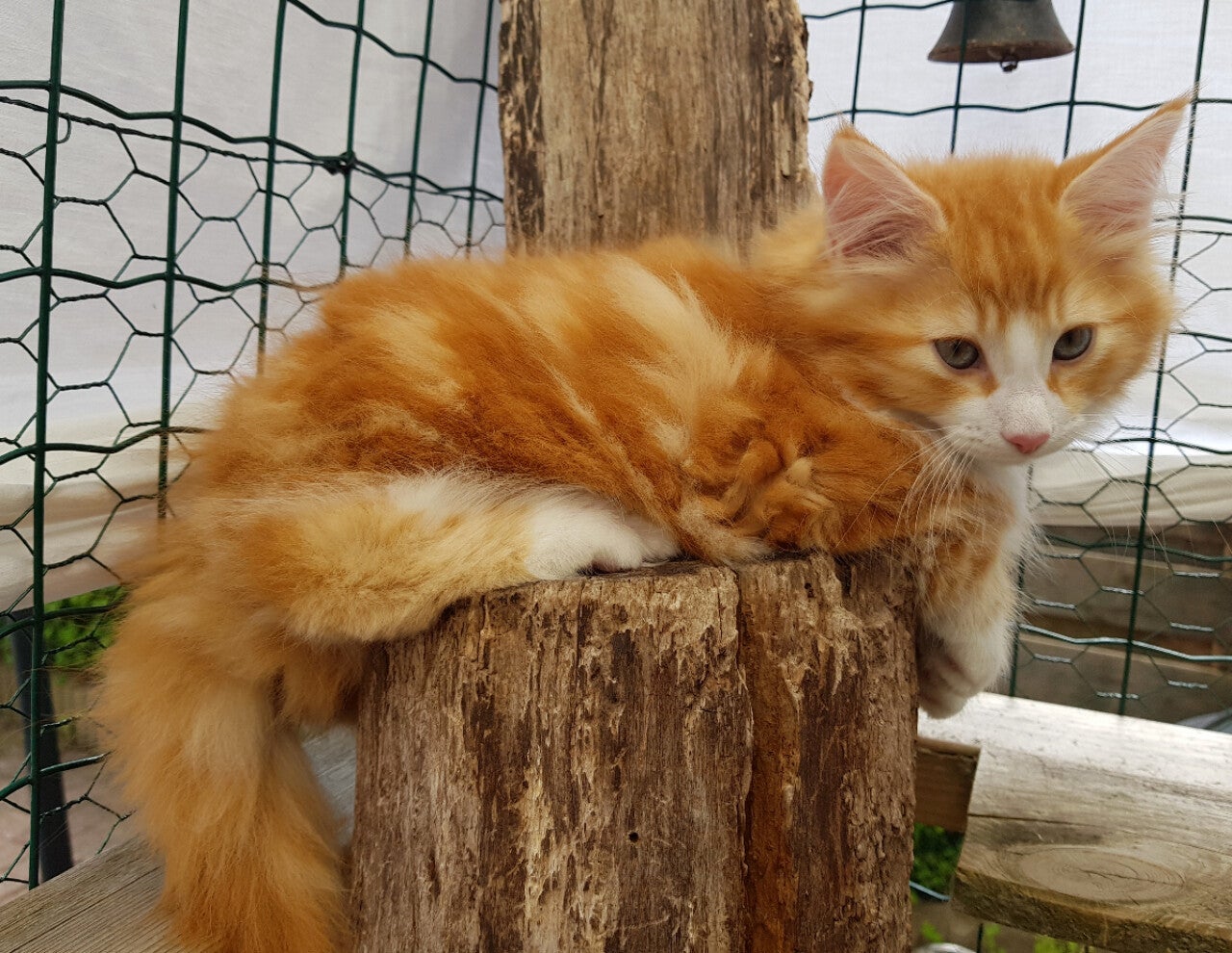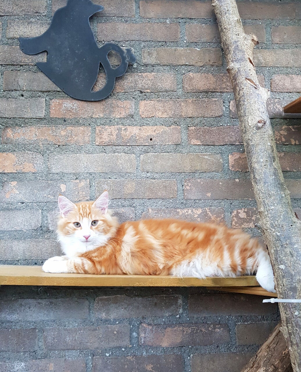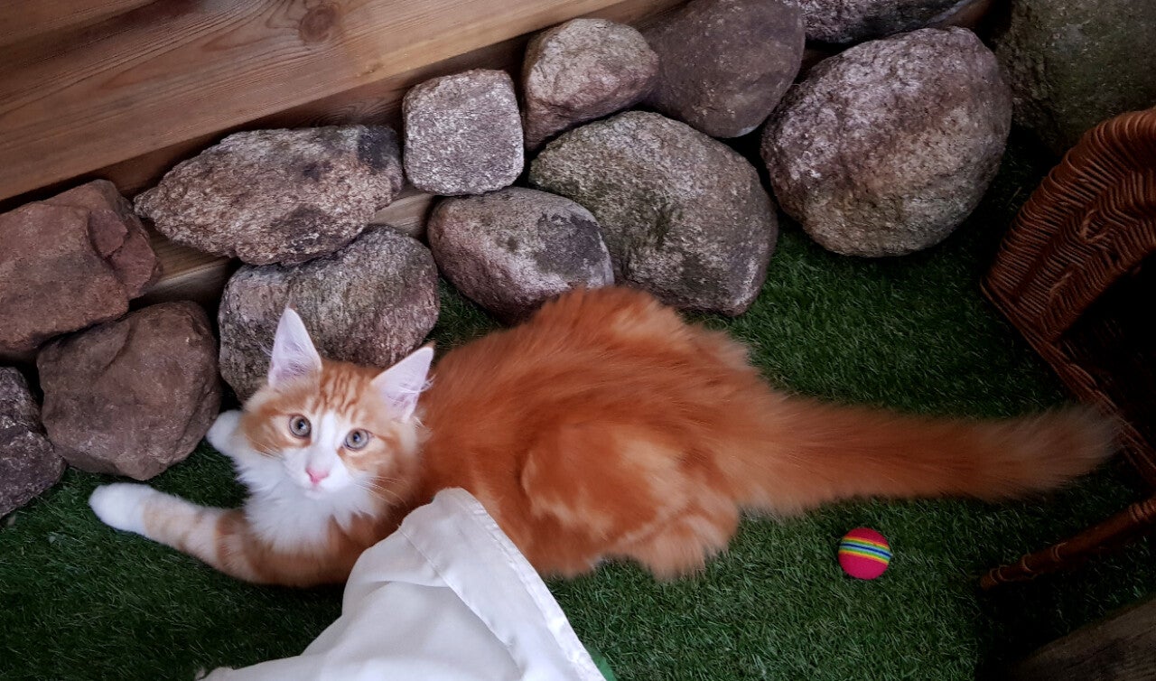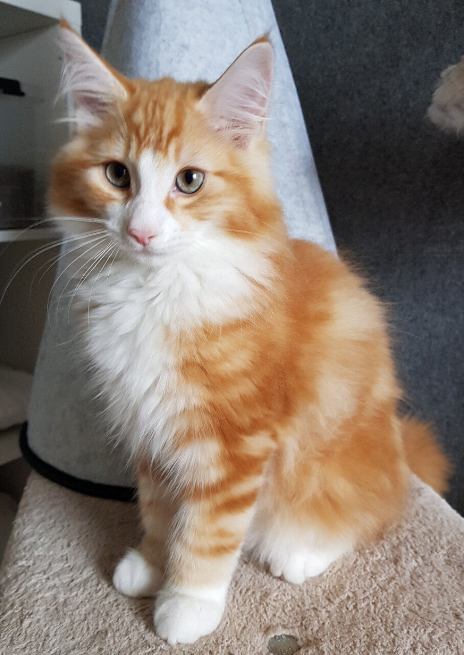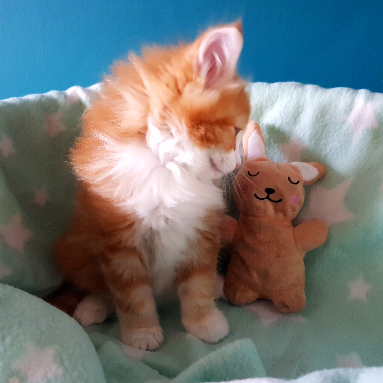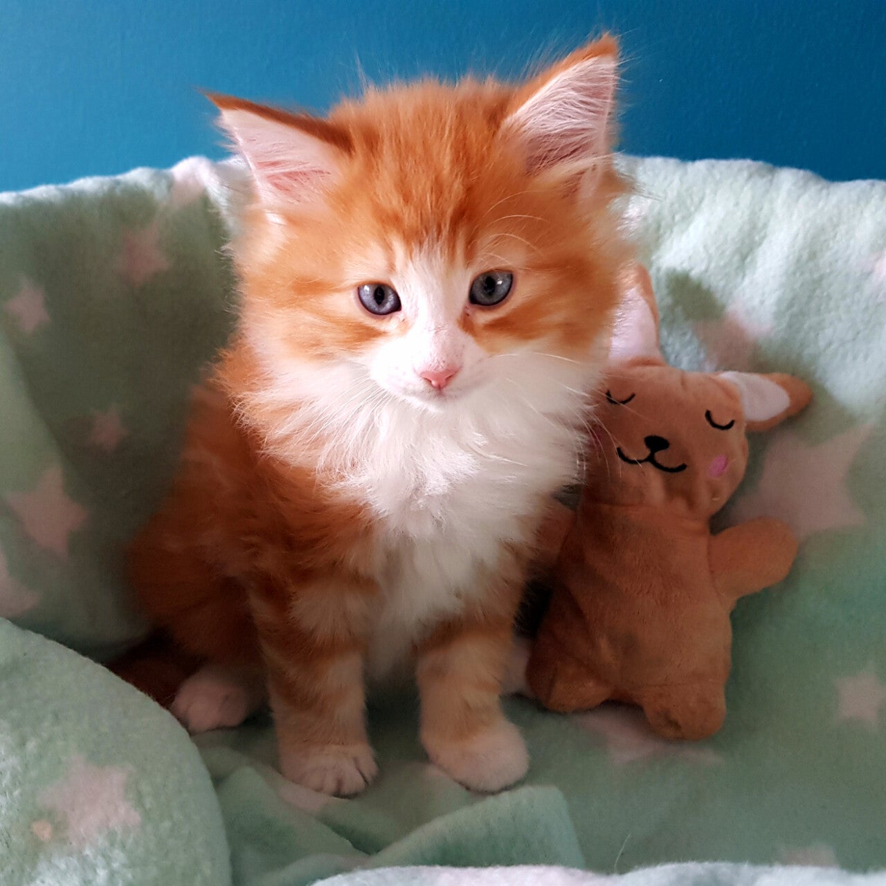 11-7-2020: 14 weken jong zijn de 7 ling en Julien groeit en speelt zoals we niet anders zouden verwachten. Een heerlijk lief boefje die op dat moment 2,130 kg woog. Julien en Cosma blijven wat langer bij ons omdat ze naar België verhuizen en dat is voor ons geen straf en zeker voor Sissel ook erg leuk. Zo gaan zij met z'n drietjes de beginselen van kattenkwaad uithalen de 3 ling, Caspian, Cedrik en Caspar, wel bijbrengen.... Ook al realiseren we ons dat ook Julian ooit verhuisd, we gaan nog lekker van de verlengde tijd genieten. Of niet dan, lief rood knuffel beertje!