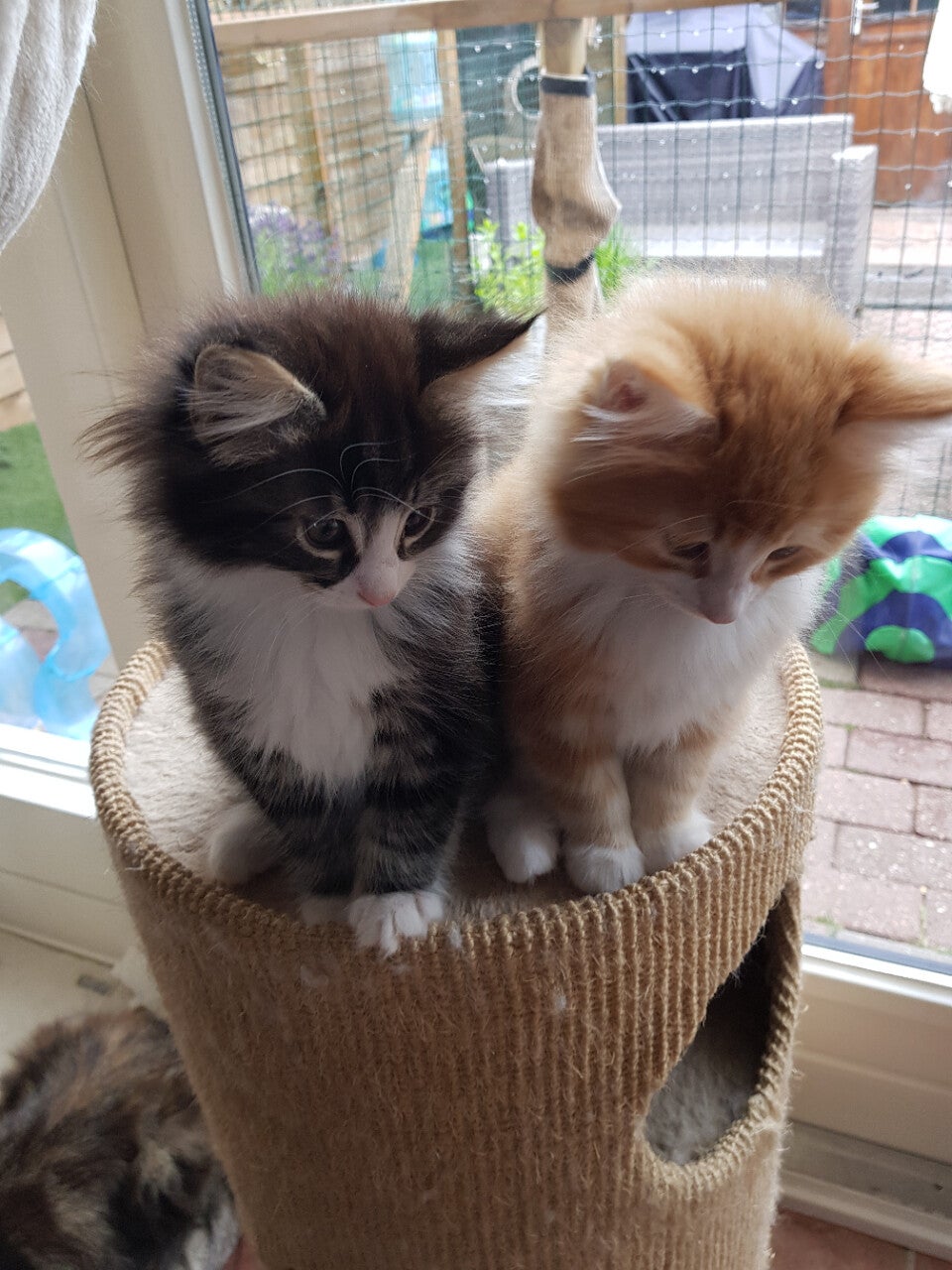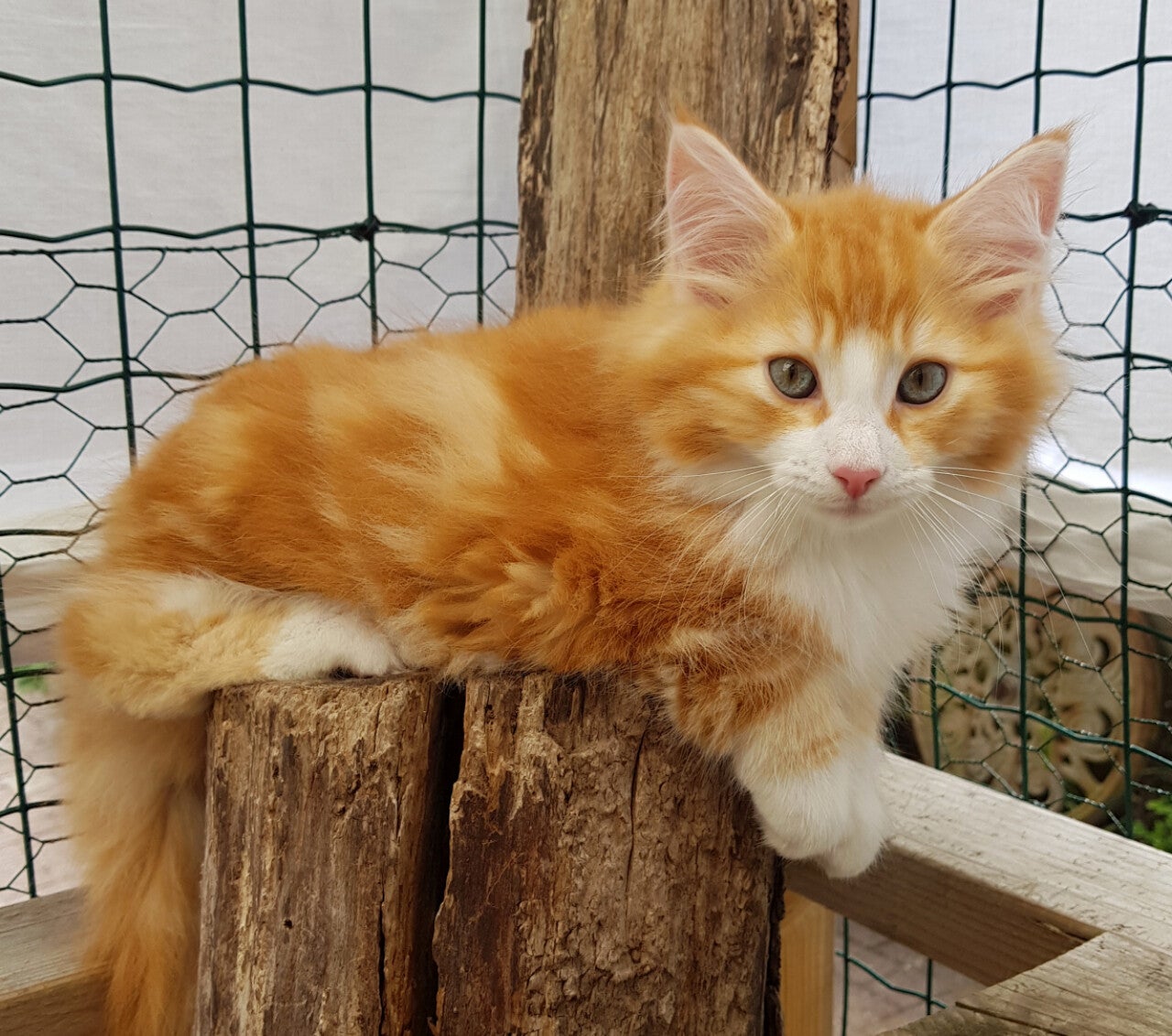 6-6-2020: Het beertje, het charmeurtje Julien weegt op dit moment 1,210 kg. Hij heeft een mooie bouw wat een heerlijk grote Noorse jongeman voorspelt. Ook Julien heeft zijn spin-motortje al snel aan staan als je hem kriebelt of soms al als je naar hem kijkt. Alle kittens zijn aanhankelijk en mooi maar als we Julien met zijn gezellige wollige billetjes zien rond huppelen en stoere acties zien uithalen kun je niet anders dan glimlachen. Ook van Julien deze keer dagelijks leven en bezoek foto's want ze hebben het veel te druk om echt te poseren. En een foto met broer Cosma samen, ze zaten zo schattig op de krabton en gaan t.z.t. ook samen verhuizen.