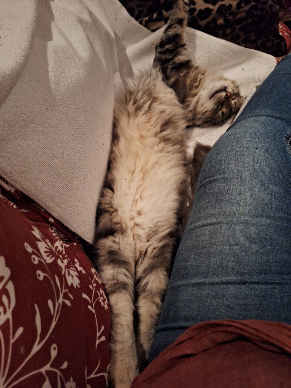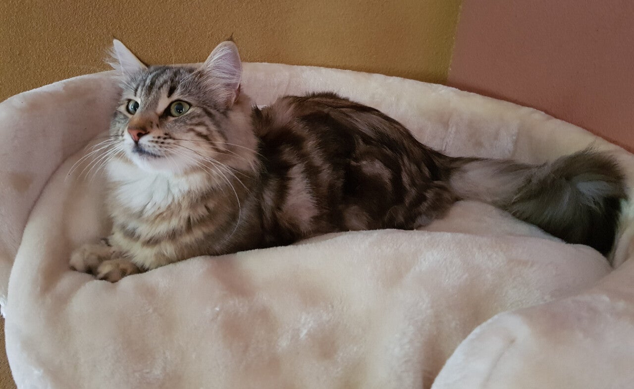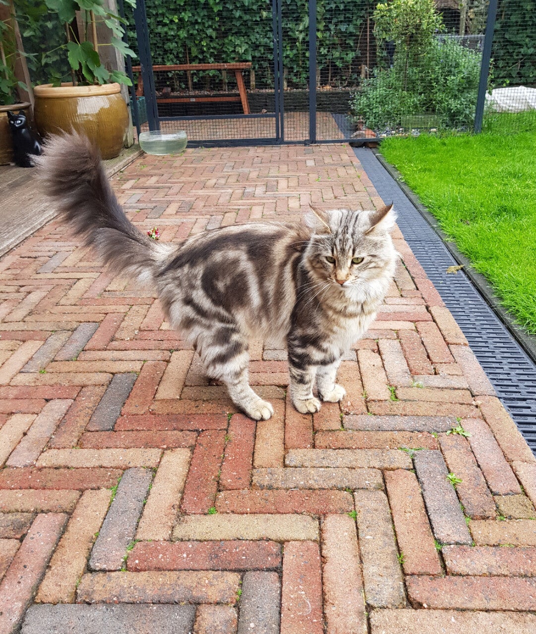 Mooie Hanna is op 6 oktober 2021 geboren in Norg bij cattery Kjama als 1 van 6 kittens. Zoals het wel eens kan gebeuren met een mooi nestje was fokster Karina helemaal verzot op haar en Hanna mocht blijven om de lijnen in de cattery verder voort te zetten. Helaas heeft Karina de eerste verjaardag van Hanna niet mee mogen maken. Bij het wie naar wie plaatsen van haar lieverds vonden wij het een hele eer om ook met Hanna verder te mogen. Eerst tot rust en veel verwerken van wat is gebeurt. Maar Hanna is heerlijk onbevangen en had binnen een week haar nieuwsgierigheid laten winnen. Inmiddels dus een heerlijk onbevangen en aanhankelijke lief jong Noren meisje. Ze is een NFO n 22, black tabby gemarmerd, amber dragend.