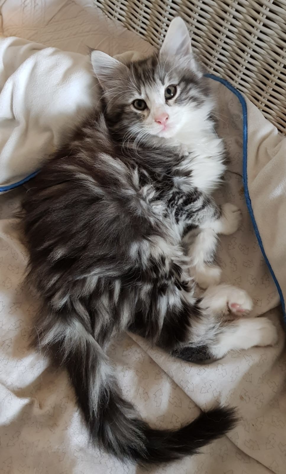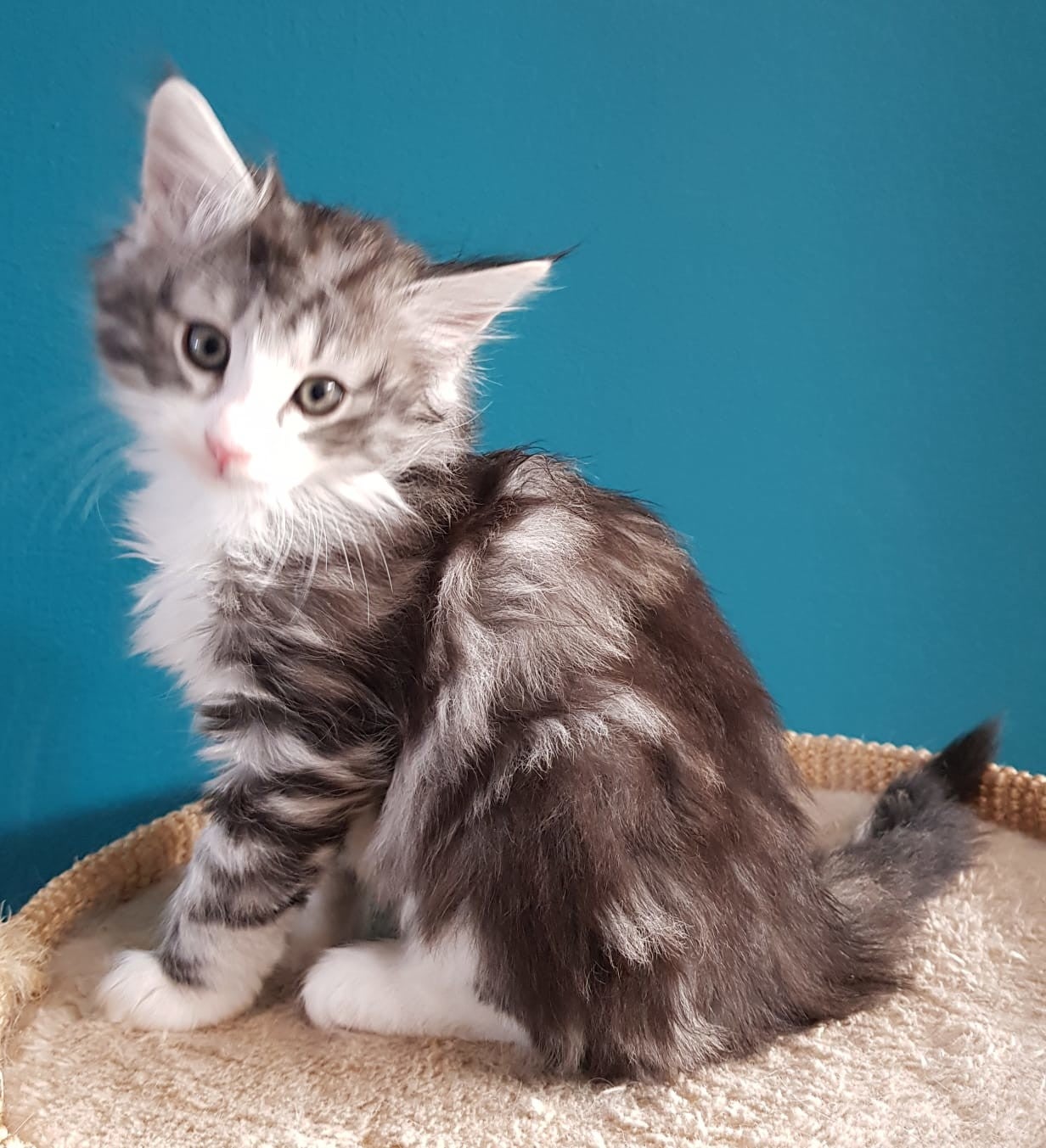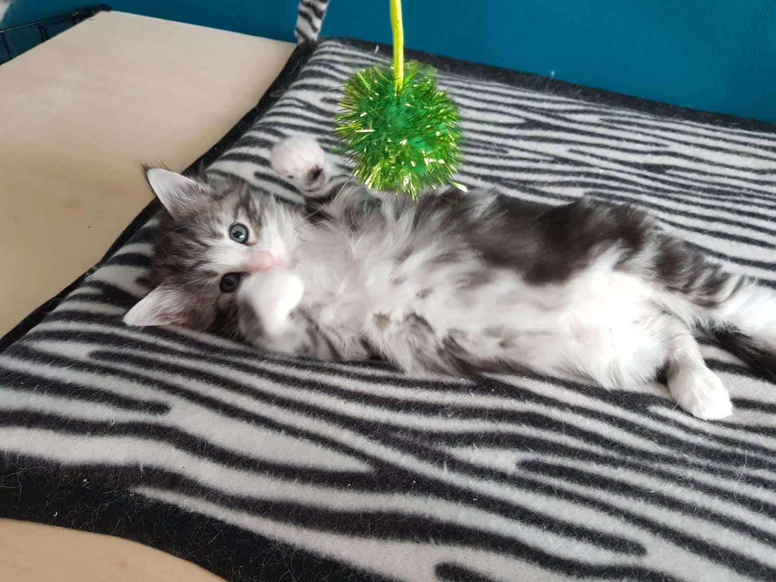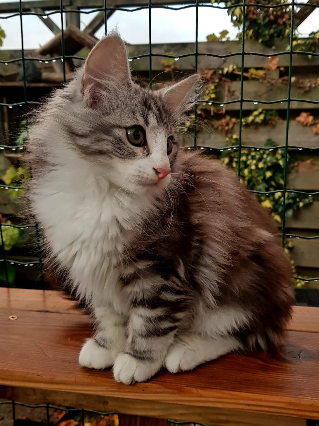 27-10-'18: Het heerlijke duveltje in het doosje, ons clowntje kjære Lillemor. Wat een heerlijke energiek Noors meisje is ze toch. Ze rent, vliegt nog net niet en laat zich niet op de kop zitten door haar broers. Zelfs half broer vakre Gideon is ze niet bang voor en hij pubert al een beetje. Maar zoals een echte Noorse bosmeid betaamt klimt ze hoog en rent heel hard. Met haar 1,660 kg gaat ze lekker op een leeftijd van 13 weken.
