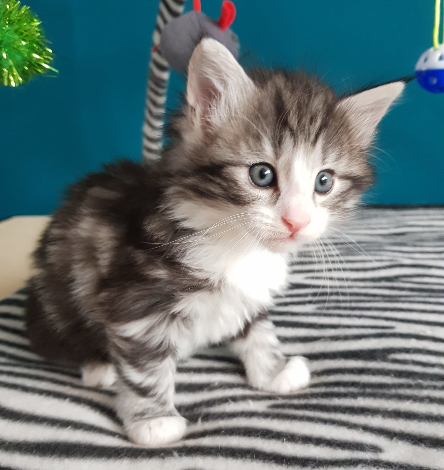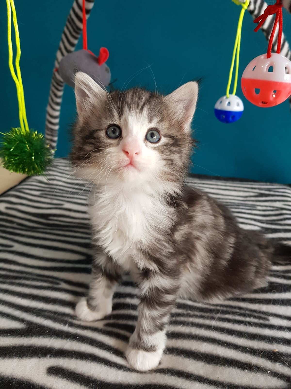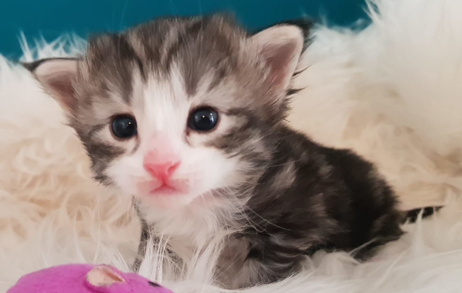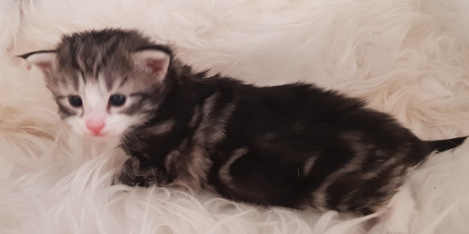 05-08-'18: Kjære Lillemor av Durathror. NFO ns 09 22, zwart zilver tabby gemarmerd mc met wit. Het poesje met het rode bandje. Kjære Lillemor is als eerste geboren om 17:45 uur en woog 118 gram. Op de foto is ze 1 week jong en weegt 246 gram. Ook Lillemor is nieuwsgierig naar de wereld, haar oogjes gaan al wat open.