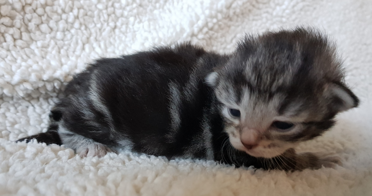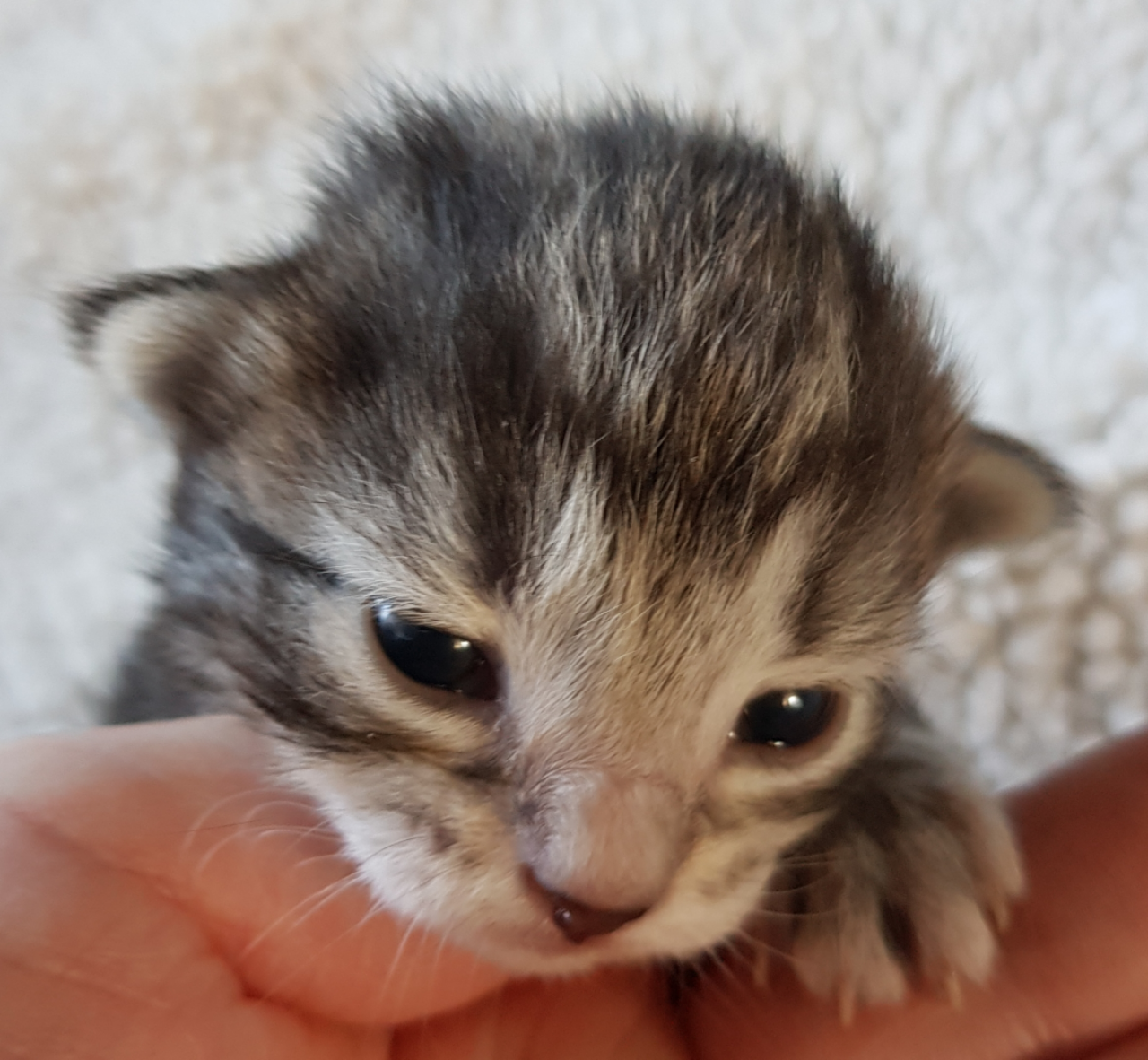 Op onderstaande foto's is Arabelle anderhalve week. Ze had 1 oogje al een heel klein stukje open bij haar geboorte en inmiddels zien we ze allebei. Bij haar weeg moment op dag 14 woog ze 294 gram.