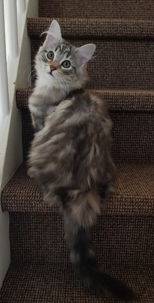 Dit mooie meisje heeft als kleurcode NFO ns 22 (zwart tabby gemarmerd). Op het moment komt het op de foto's nog wat donker over maar net als bij haar zus zien wij al steeds meer het mooie patroon doorkomen en de kleur ontwikkeling.