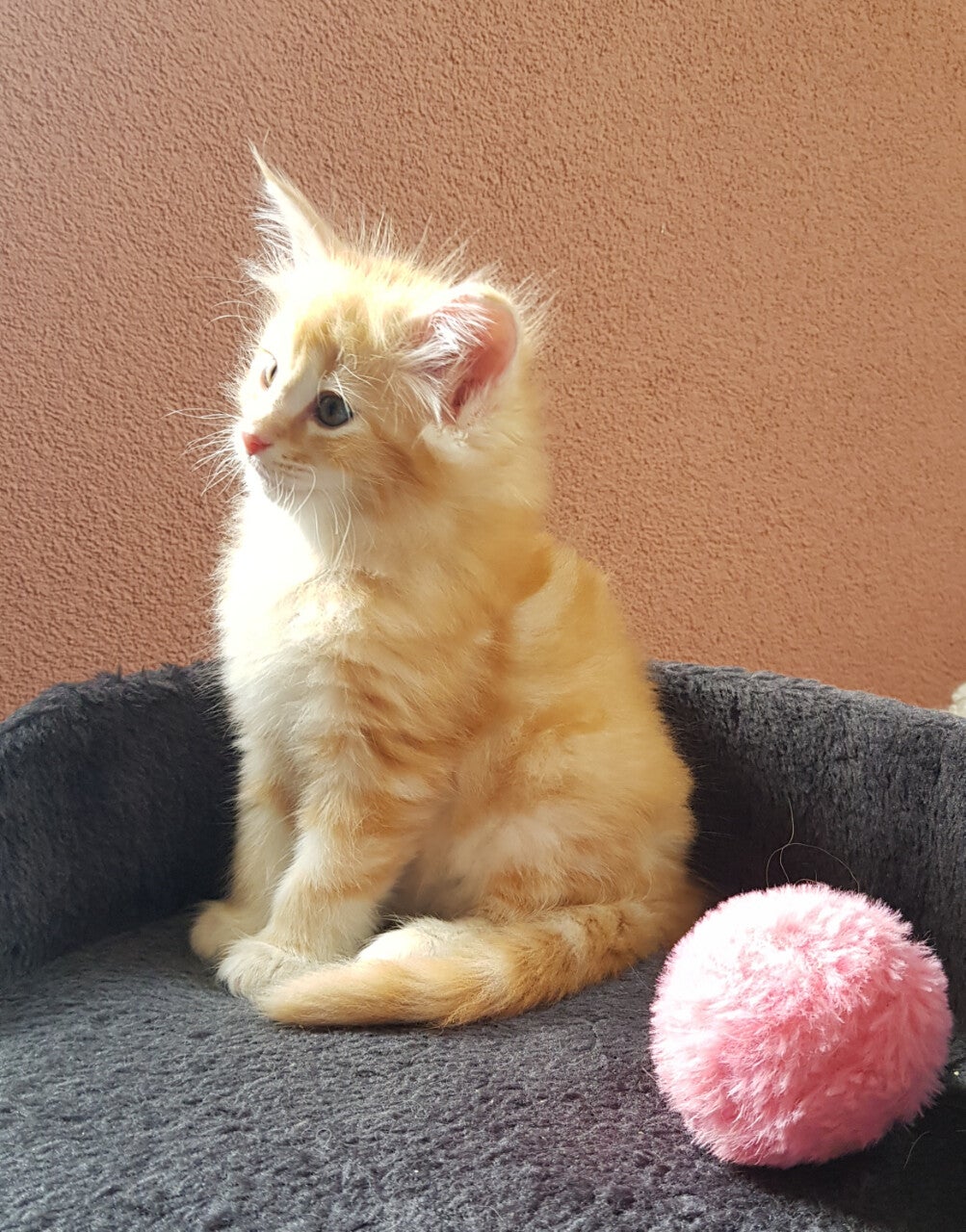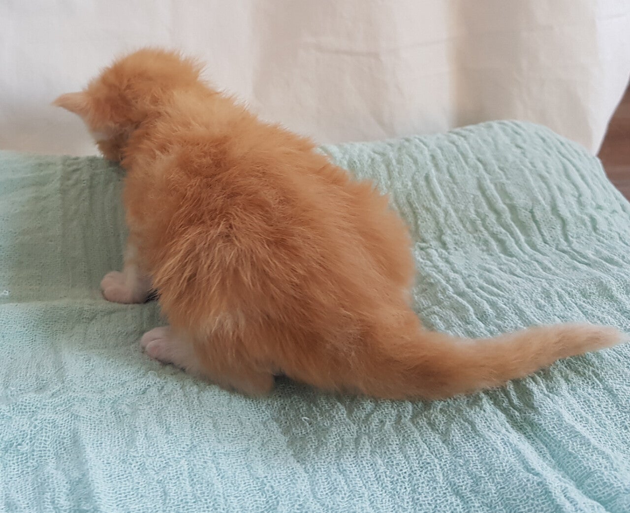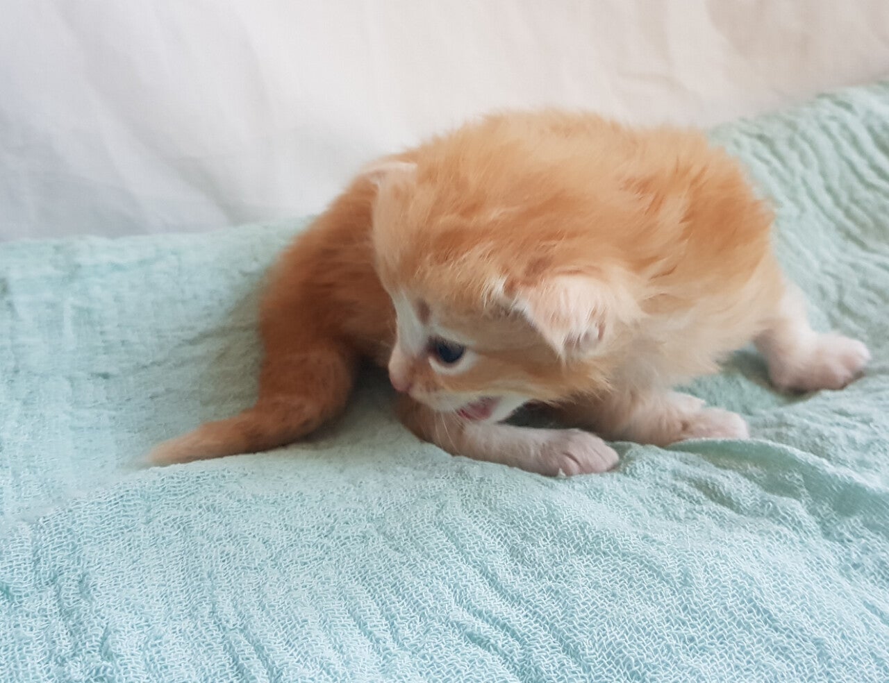 En daar kwam om 15:58 uur het 2e rooie meisjes kind! Een stuk kleiner met haar geboorte gewicht van 80 gram dan haar zus Sága maar ook de tekening, de diepte van het rood qua kleur en vooral haar koppie zijn wezenlijk anders. Een lief meisje die heus ook pittig is maar te lief om de groteren te verdringen dus daarom kreeg Siri ook een 2x per dag wat extra melk uit het flesje. NFO d 22: Siri is een red tabby blotched (rood gemarmerd).