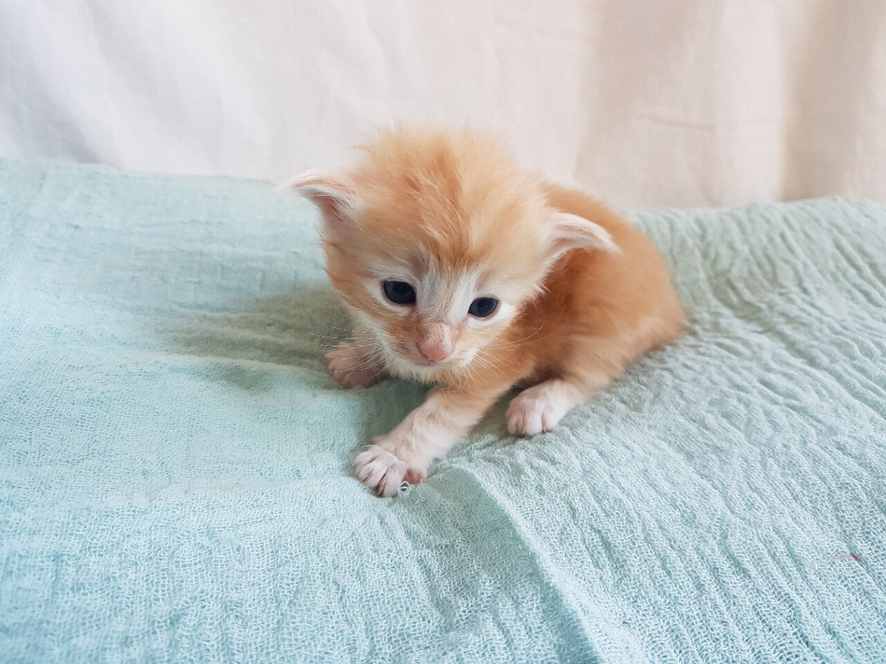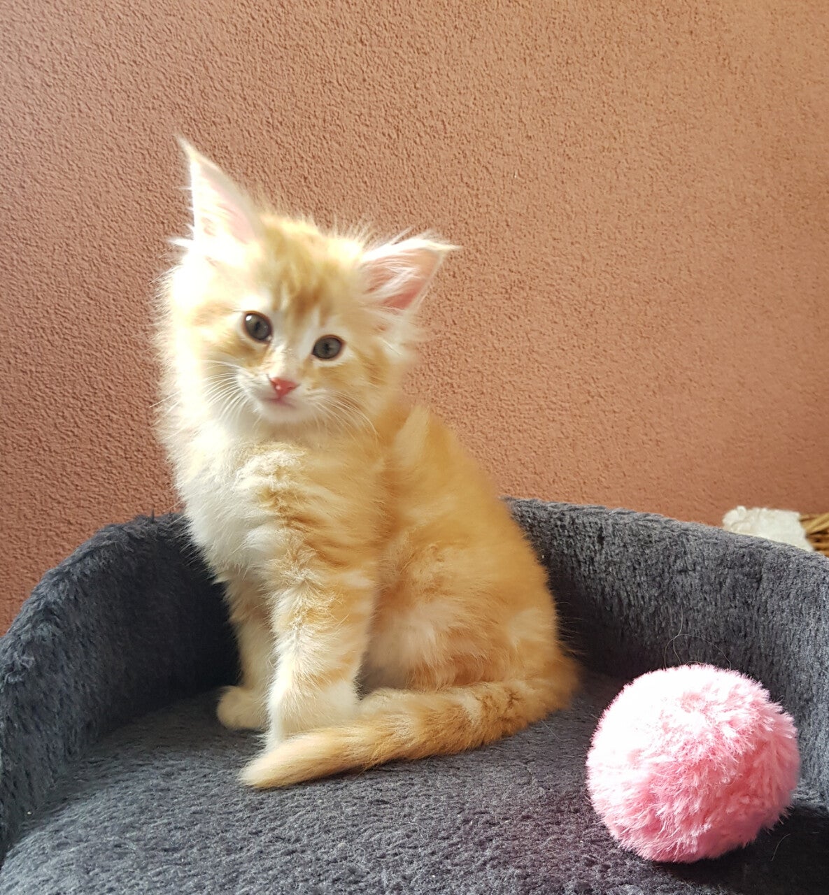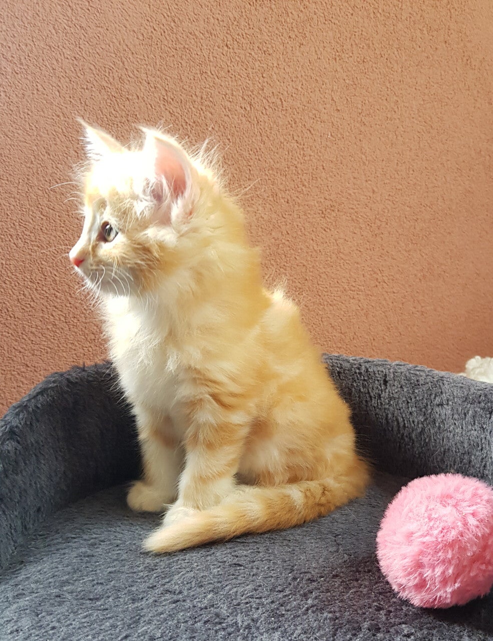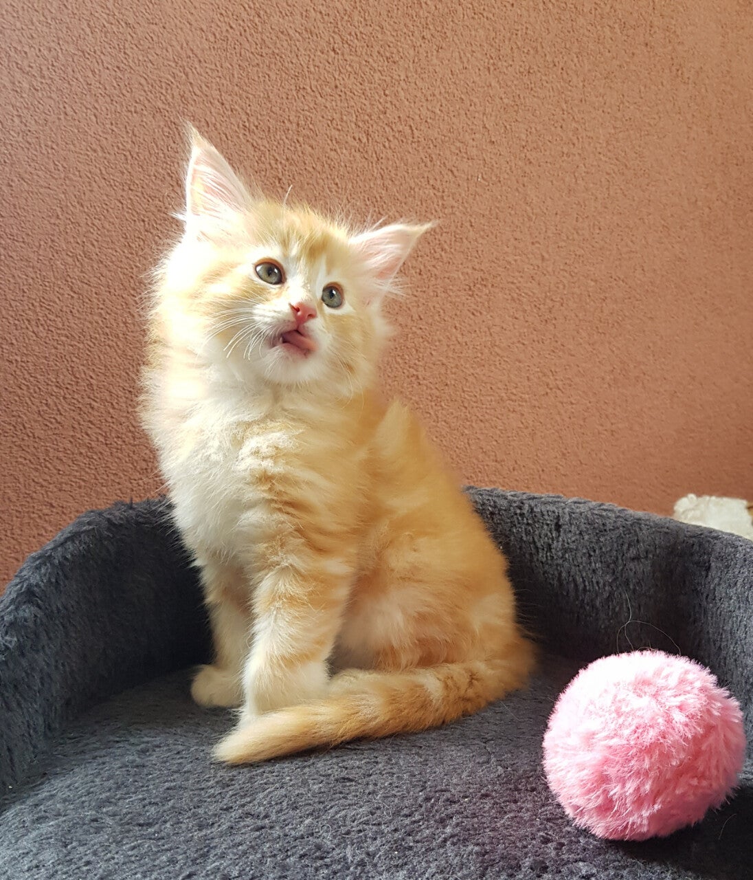 En daar kwam om 15:58 uur het 2e rooie meisjes kind! Een stuk kleiner met haar geboorte gewicht van 80 gram dan haar zus Sága maar ook de tekening, de diepte van het rood qua kleur en vooral haar koppie zijn wezenlijk anders. Een lief meisje die heus ook pittig is maar te lief om de groteren te verdringen dus daarom kreeg Siri ook een 2x per dag wat extra melk uit het flesje. NFO d 22: Siri is een red tabby blotched (rood gemarmerd).