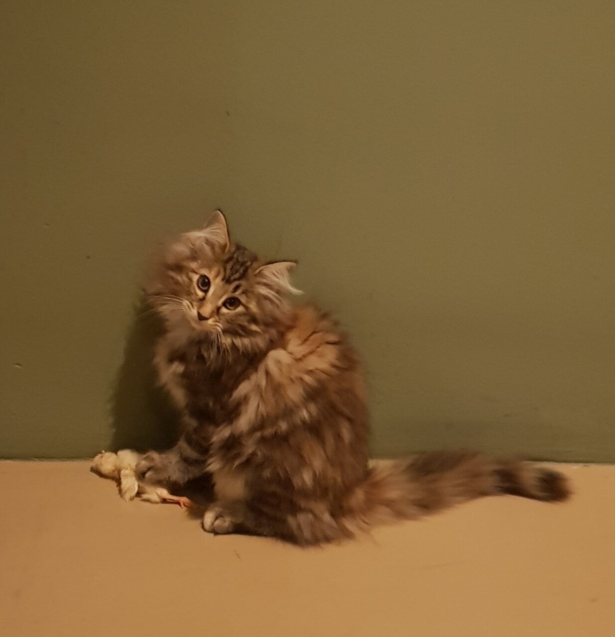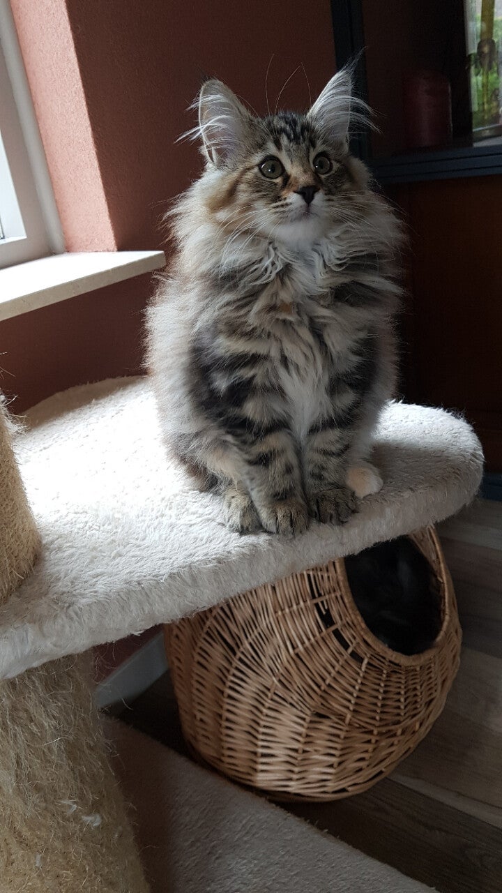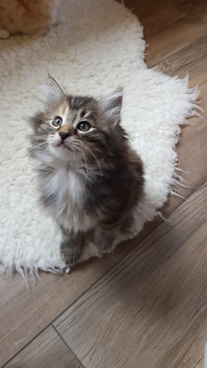 Prachtig, prachtig, een 2e tortie meisje werd om 16:37 uur geboren met 98 gram geboorte gewicht! Gelukkig wel anders in de kleur verdeling i.v.m. de herkenning met haar zusje en ook een heel ander karakter. NFO fs 22: Synne is een echte black tortie silver blotched (zwarte 3 kleur gemarmerd) want die types weten wat ze willen. Ze kan de dingen heel goed zelf! Lekker eigenwijs koppie met de ene helft meer rossig in de kleur verdeling. Synne en haar zusjes Signe en Siri hadden een beetje hulp nodig met een 2x per dag wat melk uit het flesje omdat ze ondanks de sterke karakters de iets mindere plek aan de bar hadden. Lang heeft het met haar en Siri niet geduurd: ze kan zelf wel drinken bij mama, liever knokken voor een plek.