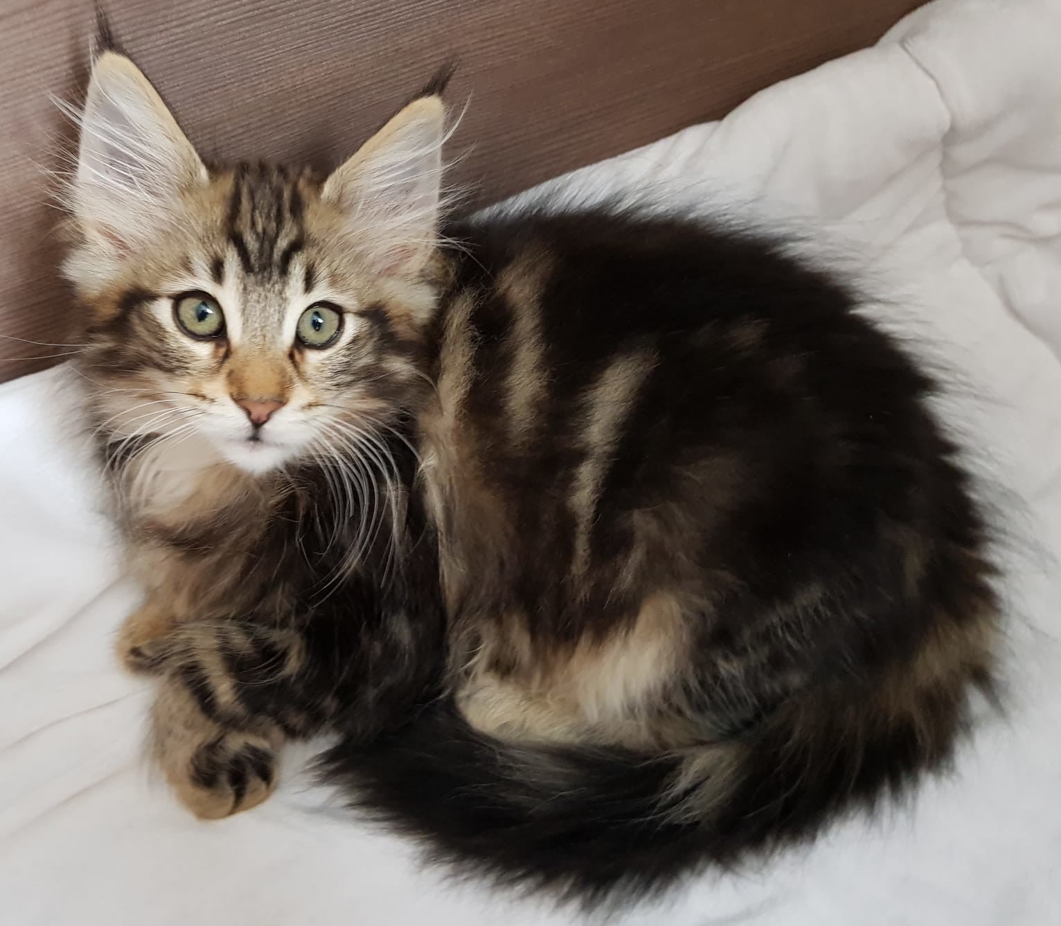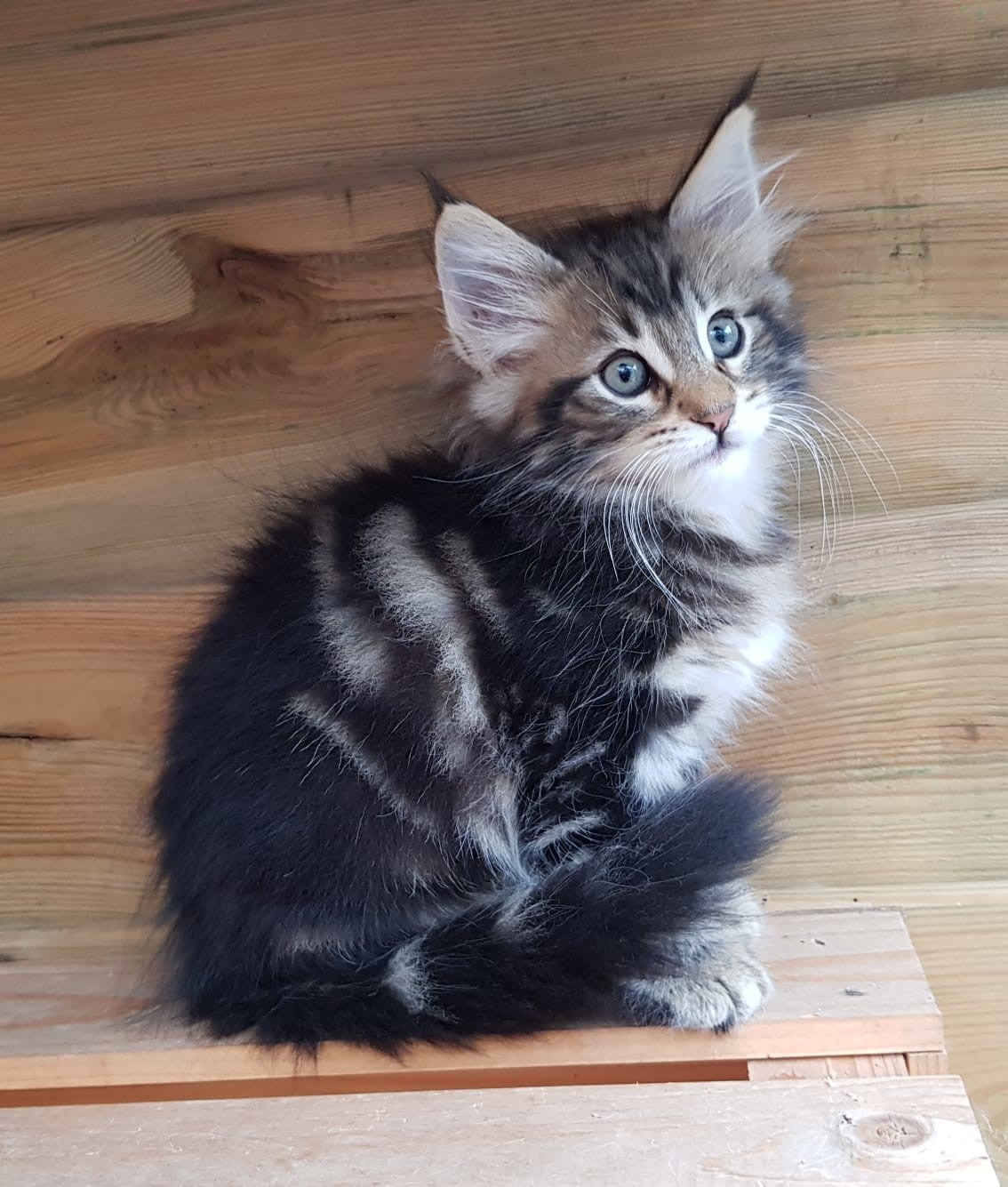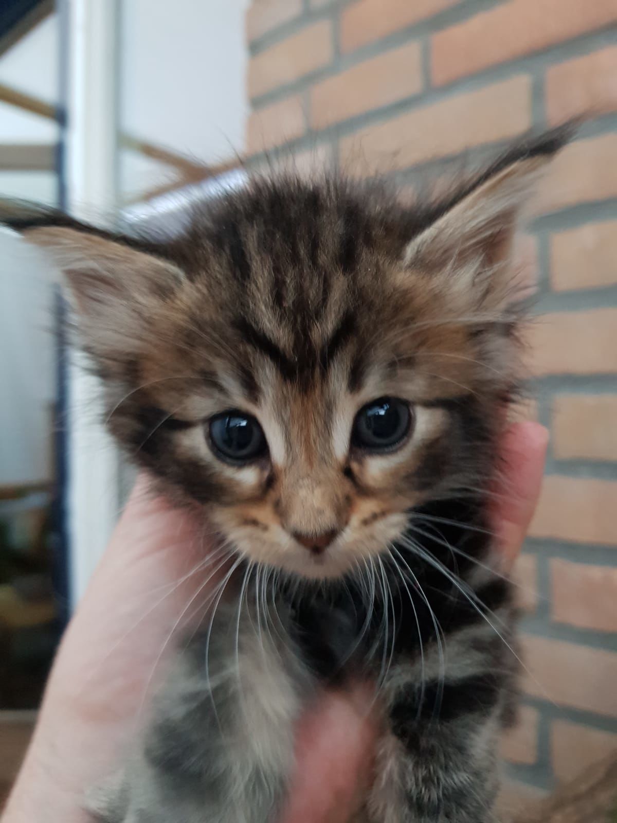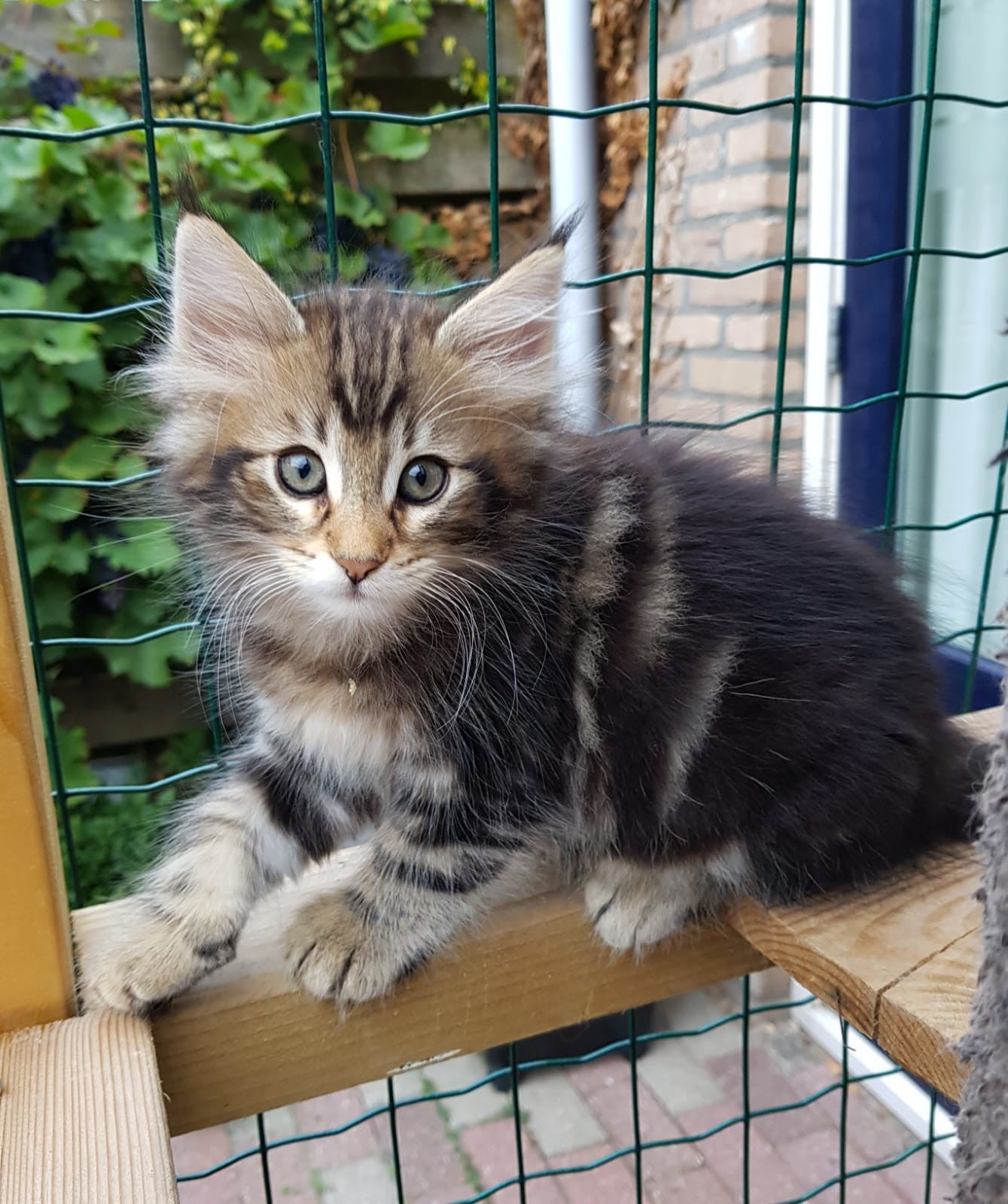 09-09-'18: stoere prinses vakre Lorelei doet wat ze wil. Ze racet net zo hard als haar grote broers en komt voor een hele snelle knuffel maar gaat dan gauw weer verder. Ze heeft het druk. Dit foto moment lukte dus ook alleen maar toen ze net wat wakker werd. Haar kleur ontwikkelt zich mooi, steeds meer verdeling hoewel ze op de foto's nog best donker lijkt. Ze is ook de donkerste maar als je haar ziet rennen beginnen de vlakken en strepen voor ons zichtbaarder te worden. Vakre Lorelei weegt 1,340 kg.