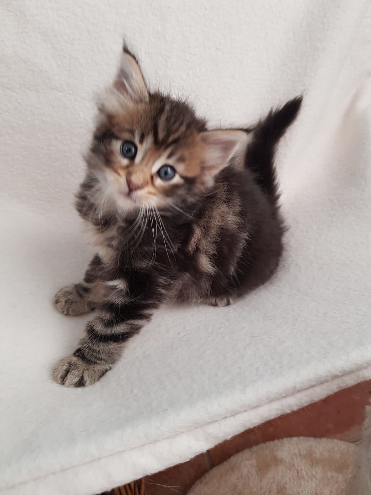 23-08-'18: 9 weken is vakre Lorelei alweer. Ze weegt 1,082 kg. Ze weet wat ze wil, heeft het druk en stoeit met haar broers. Ze is een echte stoere meid. Voor de rust gaat ze graag liggen in het hangmatje aan de radiator. Als ze zin heeft om te eten eist ze al grommend haar deel op. Nu hebben wij wel het idee dat de rest steeds minder onder de indruk is maar toch, ze wil graag laten merken dat zij het erg lekker vindt en ze allemaal te dichtbij zitten...ondanks dat het eten op een aantal dienbladen wordt gegeven zodat iedereen zijn of haar ruimte heeft. Grappig meiske!