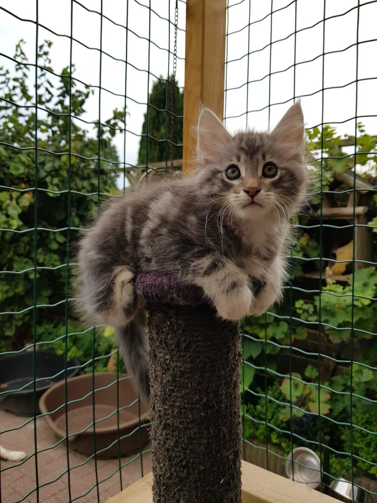 23-08-'18: en nog steeds is vakre Salomon de zwaarste van het stel met zijn 1.328 kg. Ja ja, dat lees je goed! En dat met 9 weken. Hij is nog steeds even zelfverzekerd en relaxt. De hoogte inklimmen in de ren was 1 ding, even pauzeren en om je heen kijken ging ook goed, maar ja, je moet ook weer naar beneden...als een echte Noorse boskat met het neusje naar beneden. Oke, mama Lindis en aangenomen mama Ivy kwamen hem wel in de gaten houden maar toch heeft hij het zelf gedaan.