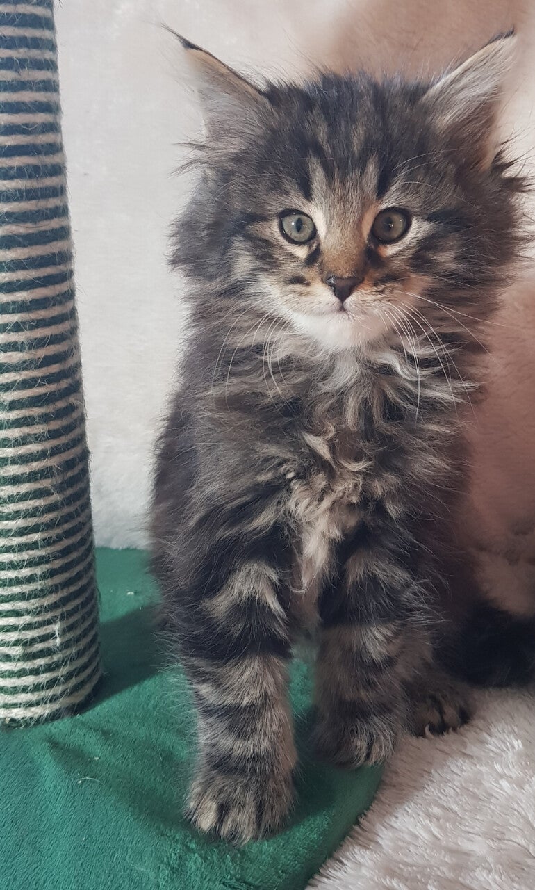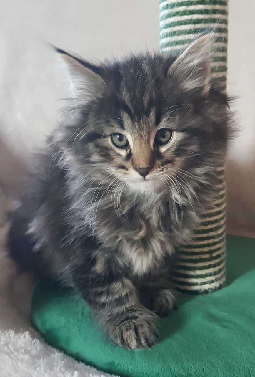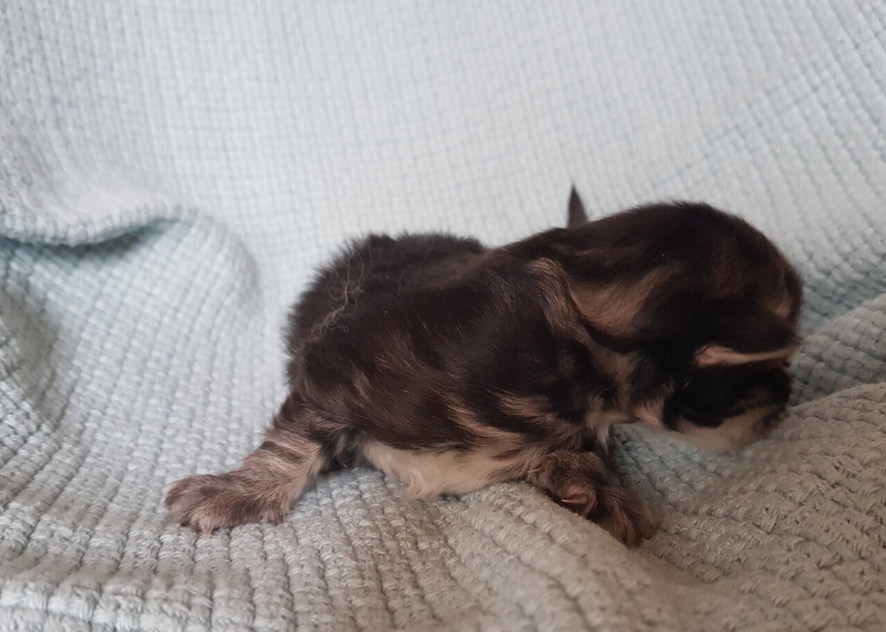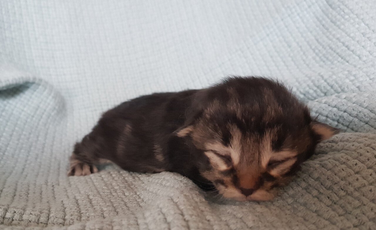 Oehh wat kwam daar om 6:00 uur een mooi donker mannetje aan, daar was Hjorr! Ook in stuitligging en een 126 gram wegende pracht. We zijn heel benieuwd hoe hij zich verder gaat ontwikkelen qua kleur en aftekening. Hjorr is een brown black tabby blotched. Zijn naam betekent in het Noors ook 'zwaard'. Ja het was even zoeken maar de eengezinsheid in de namen is weer gelukt. Alle 3 de zonen ook de naam eindigend op de letter r.
