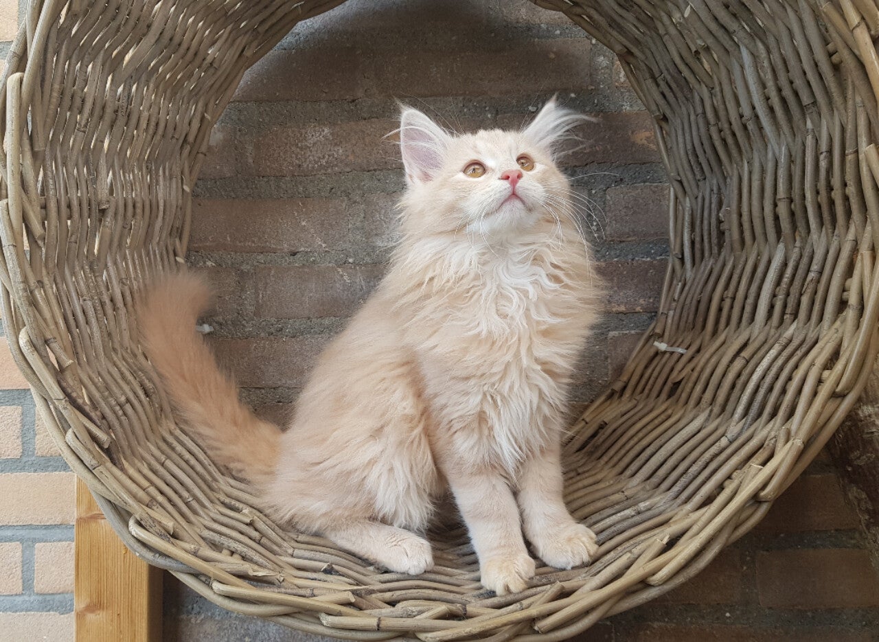 12.5e week zijn in al je creme smoke pracht! Wat een spin monstertje, zo lief en aanhankelijk maar zeker ook lekker eigenwijs. Heerlijk energiek clowntje die (kleur zoekt toch kleur) heel wijs is met zijn rode broer vakre Gideon en de blonde doggies. Viddas weegt op de leeftijd van 12 weken 1,620 kg, wat een mooi gewicht!